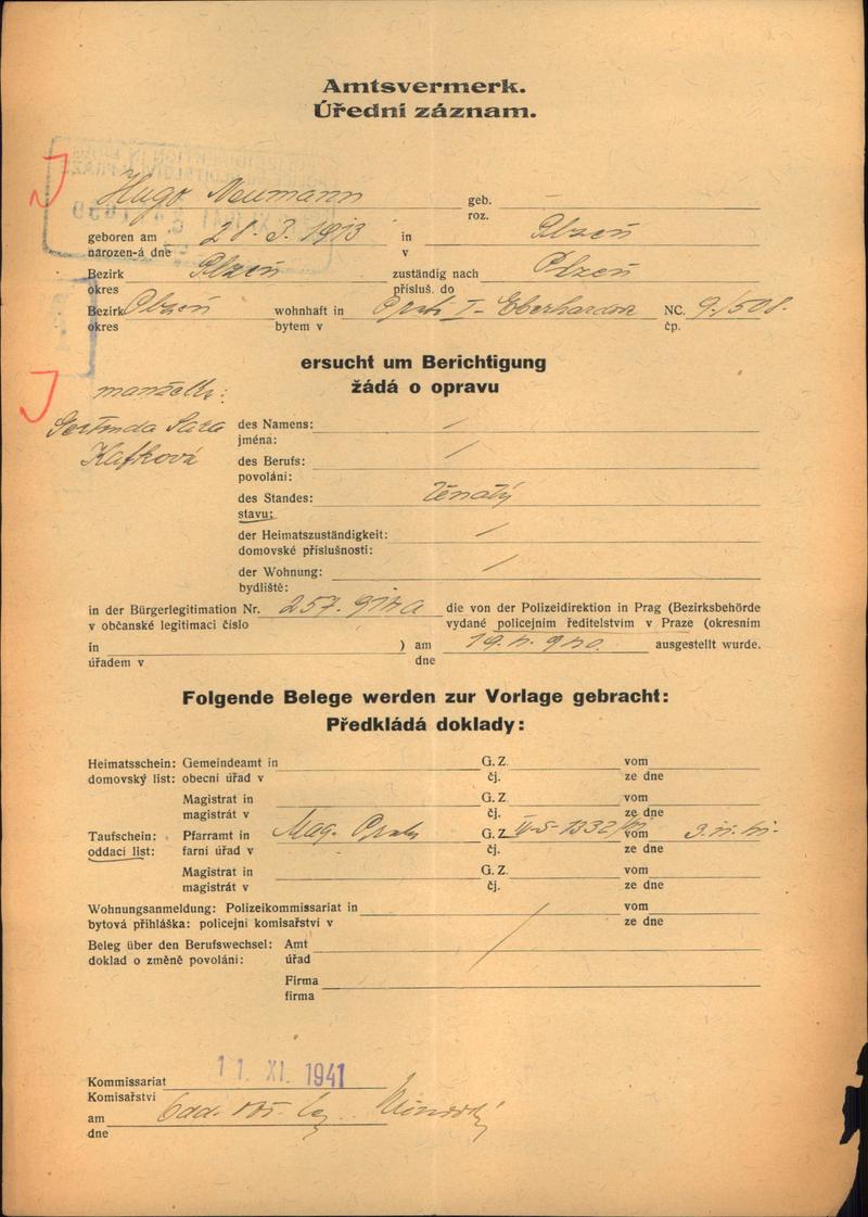 Neumann Hugo: Žádost o opravu v občanské legitimaci
