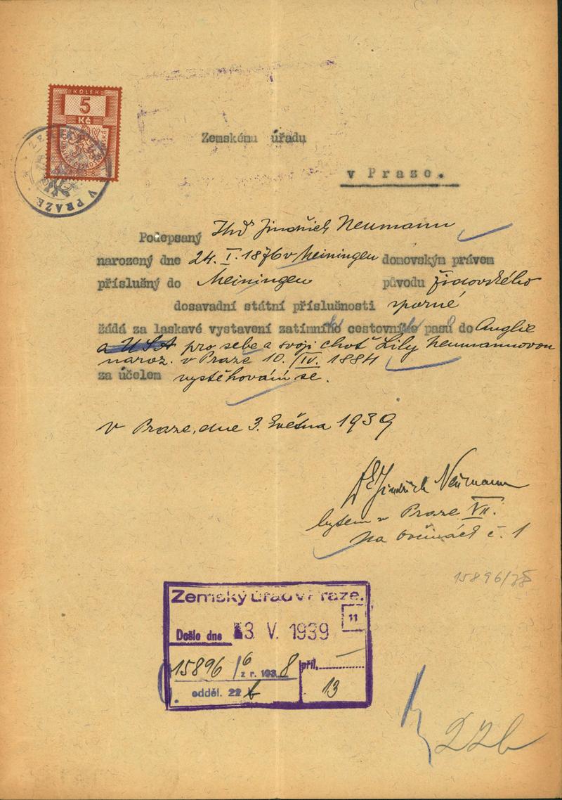 Neumann Heinrich: Žádost o vydání prozatímního cestovního pasu