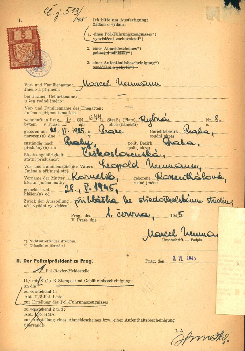 Neumann Marcell: Žádost o vystavení vysvědčení zachovalosti