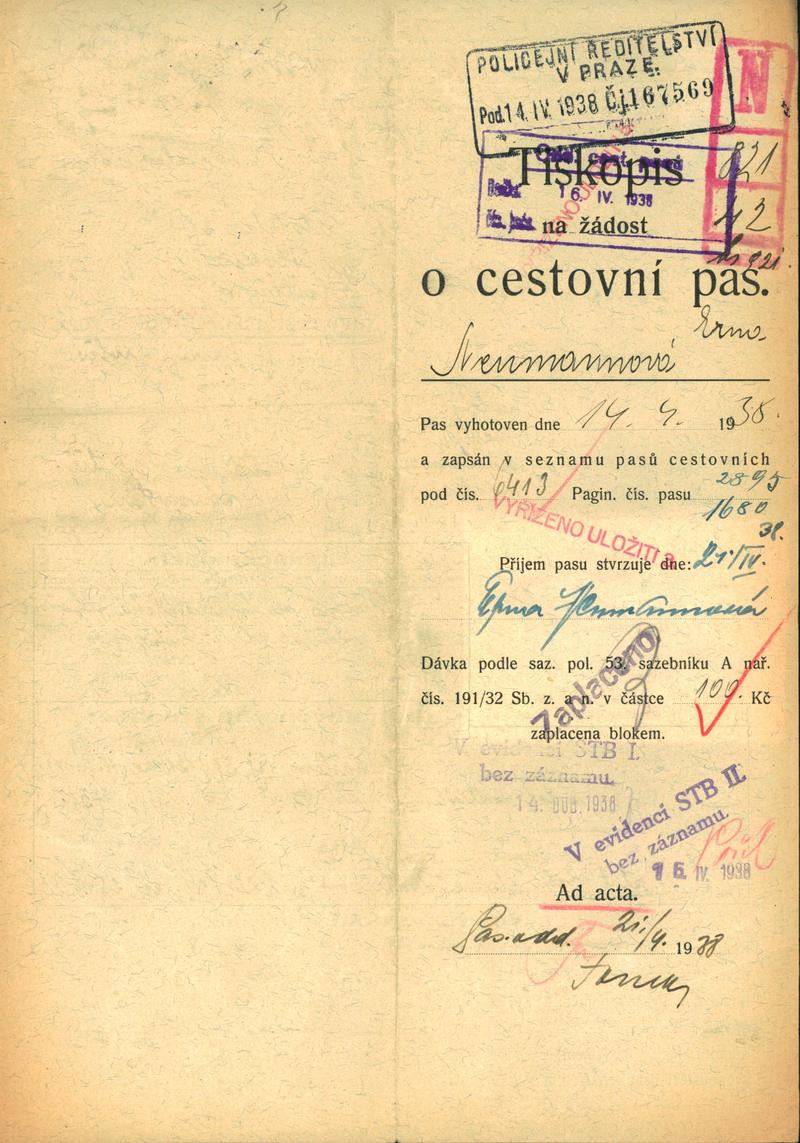 Neumannová Erna: Žádost o vydání cestovního pasu