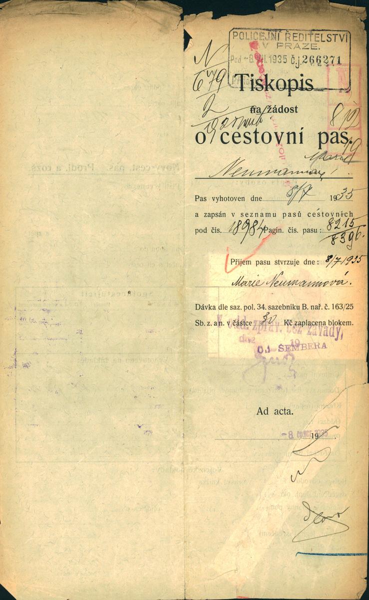 Neumannová Marie: Žádost o prodloužení cestovního pasu