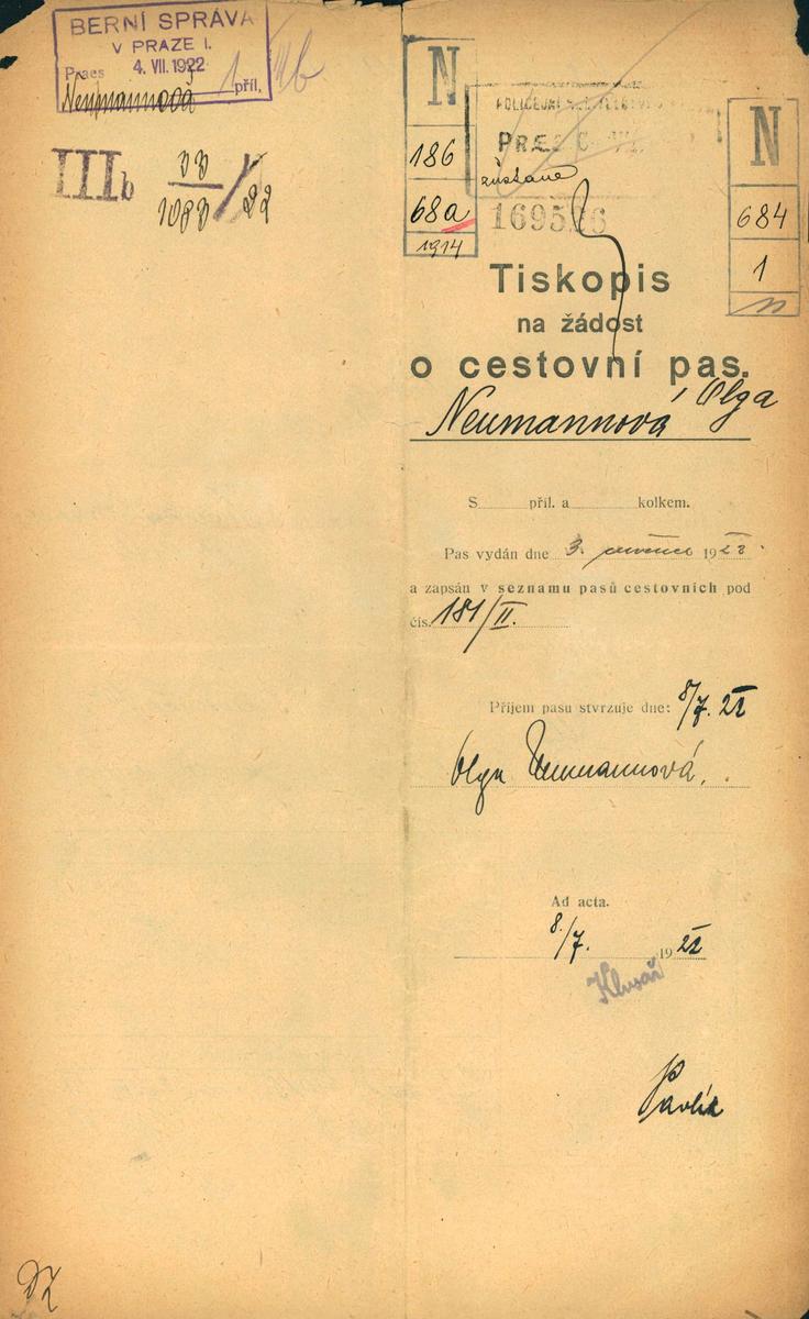 Neumannová Olga: Žádost o vydání cestovního pasu