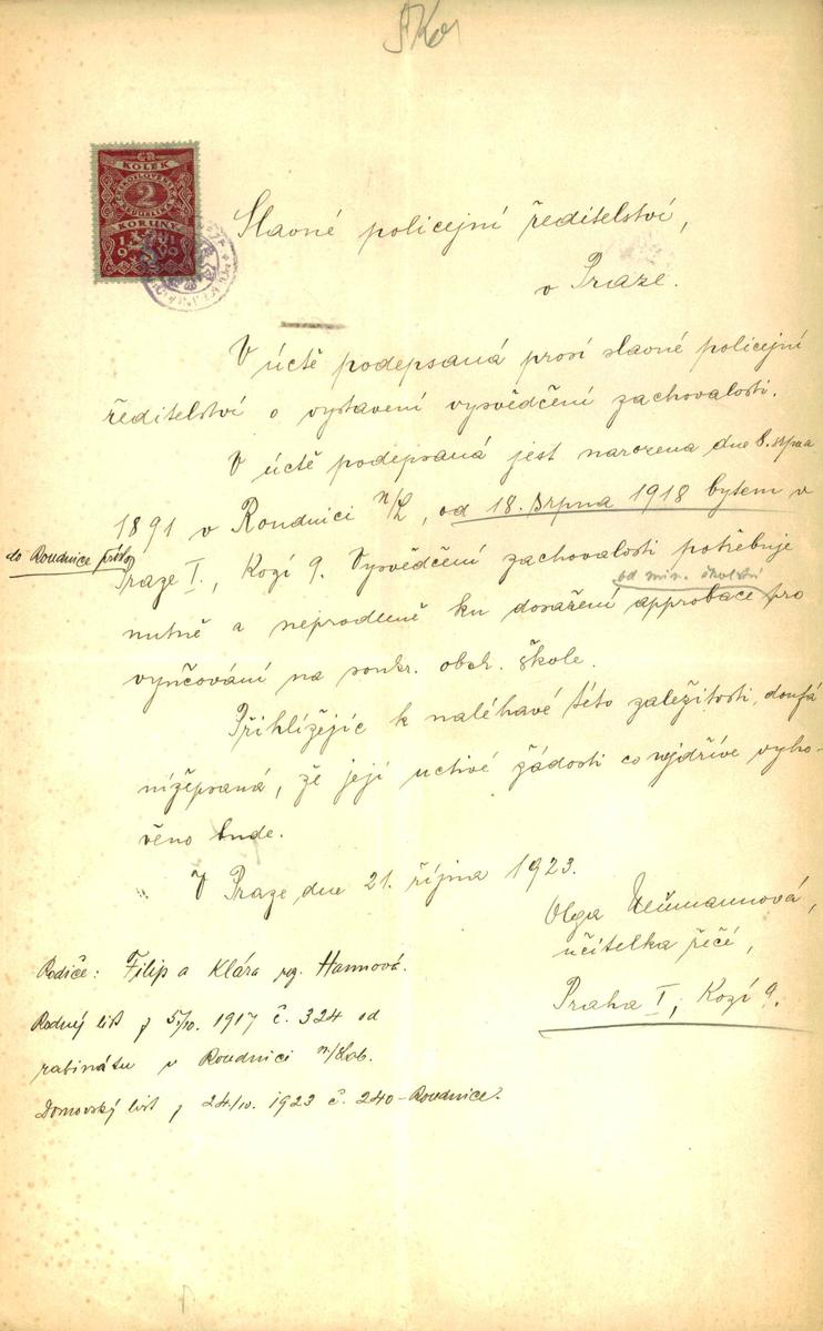 Neumannová Olga: Žádost o vystavení vysvědčení zachovalosti
