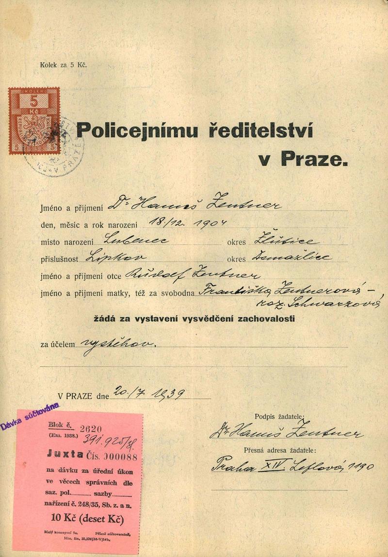 Zentner Hanuš: Žádost o vystavení vysvědčení zachovalosti