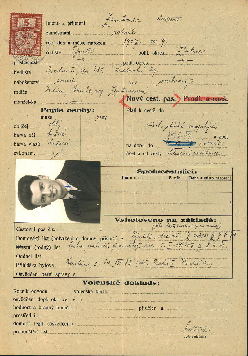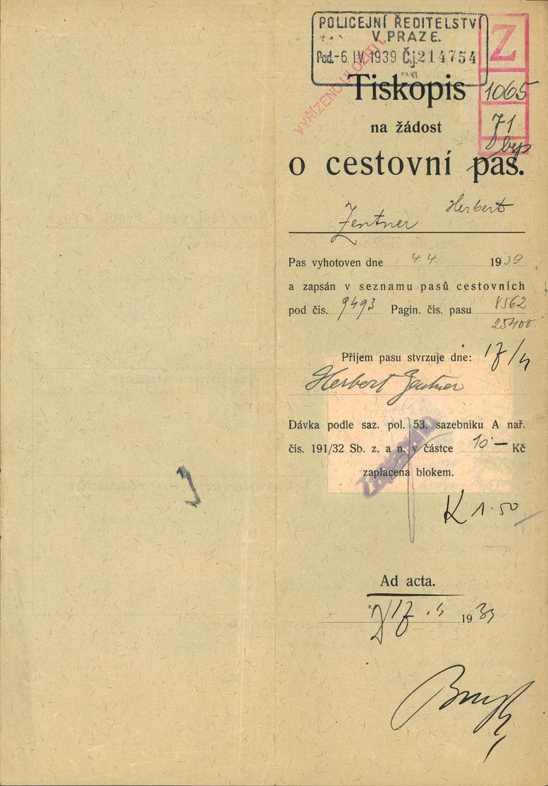 Zentner Herbert: Žádost o vydání cestovního pasu