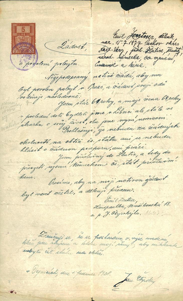 Zentner Emil: Žádost o povolení pobytu