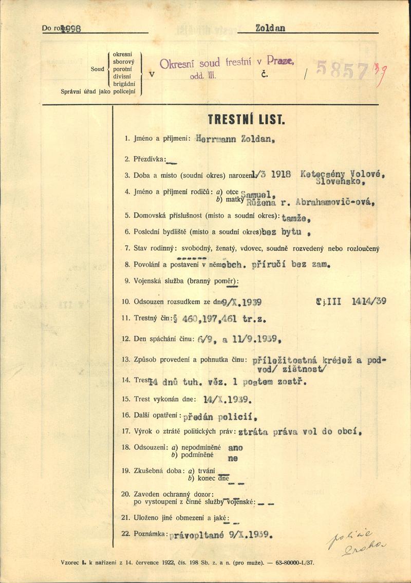 Zoldan Hermann: Trestní list