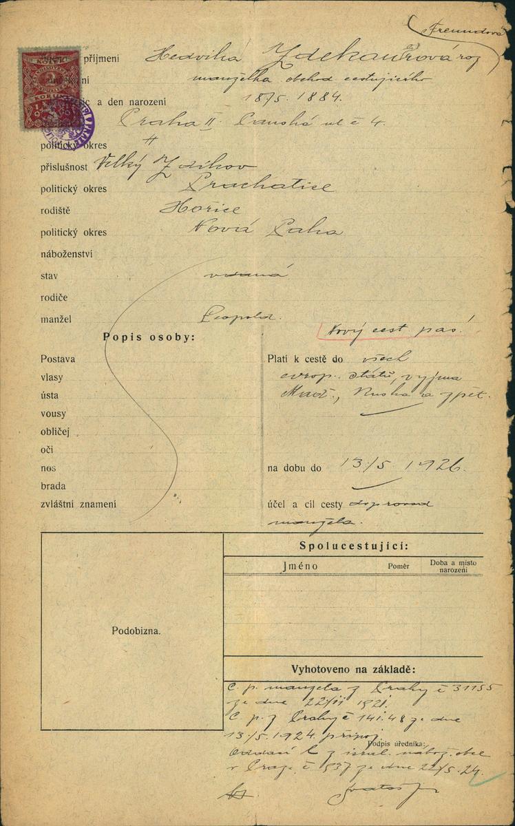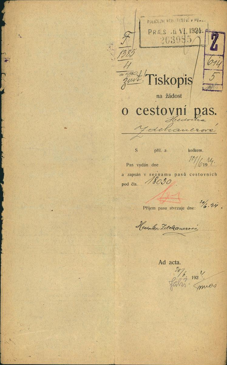 Zdekauerová Hedvika: Žádost o vydání cestovního pasu