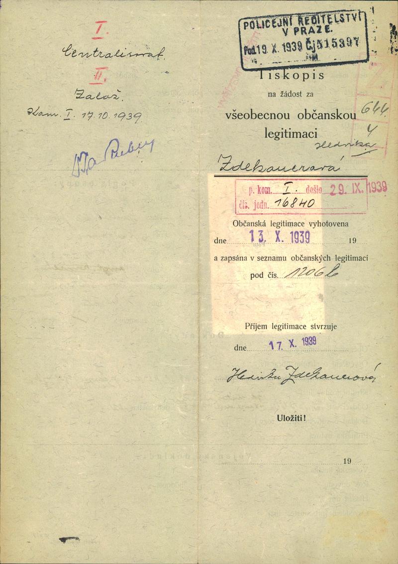Zdekauerová Hedvika: Žádost o vydání občanské legitimace