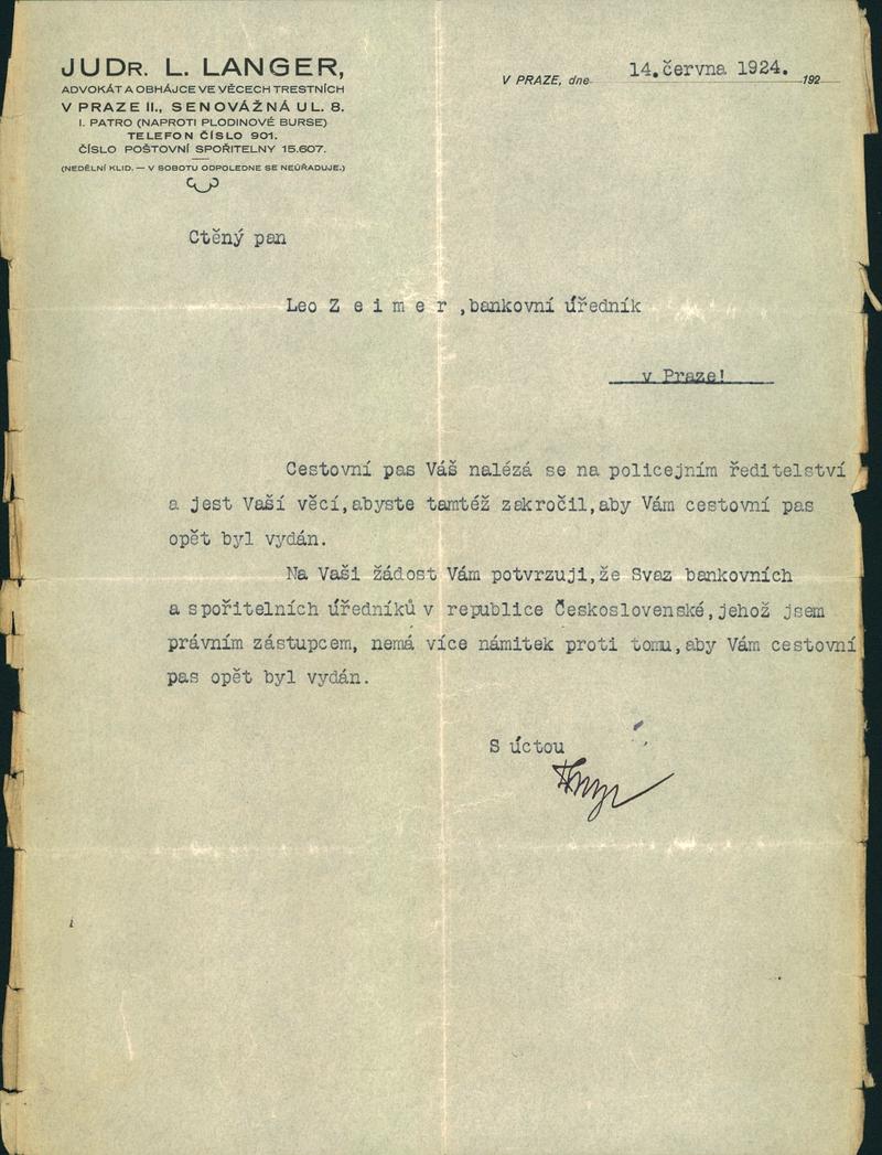 Zeimer Leo: Žádost o vrácení cestovního pasu