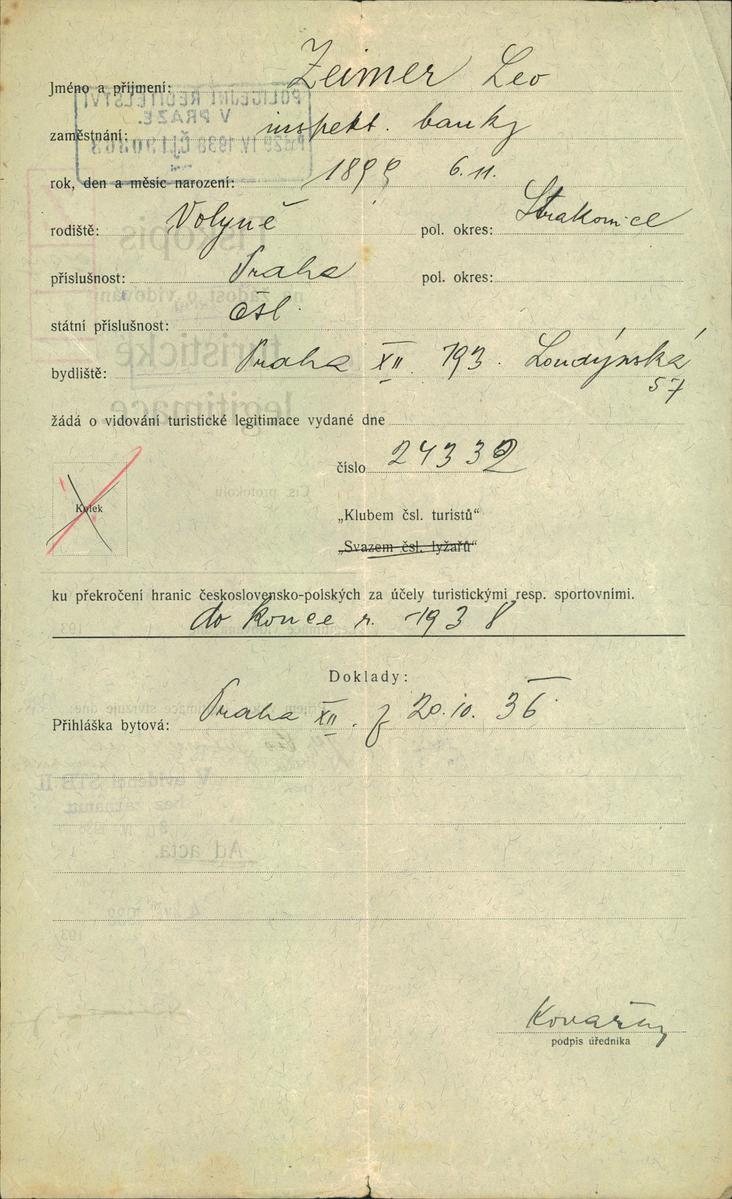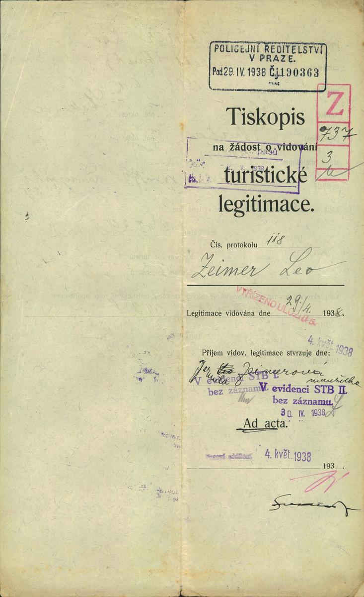 Zeimer Leo: Žádost o ověření turistické legitimace