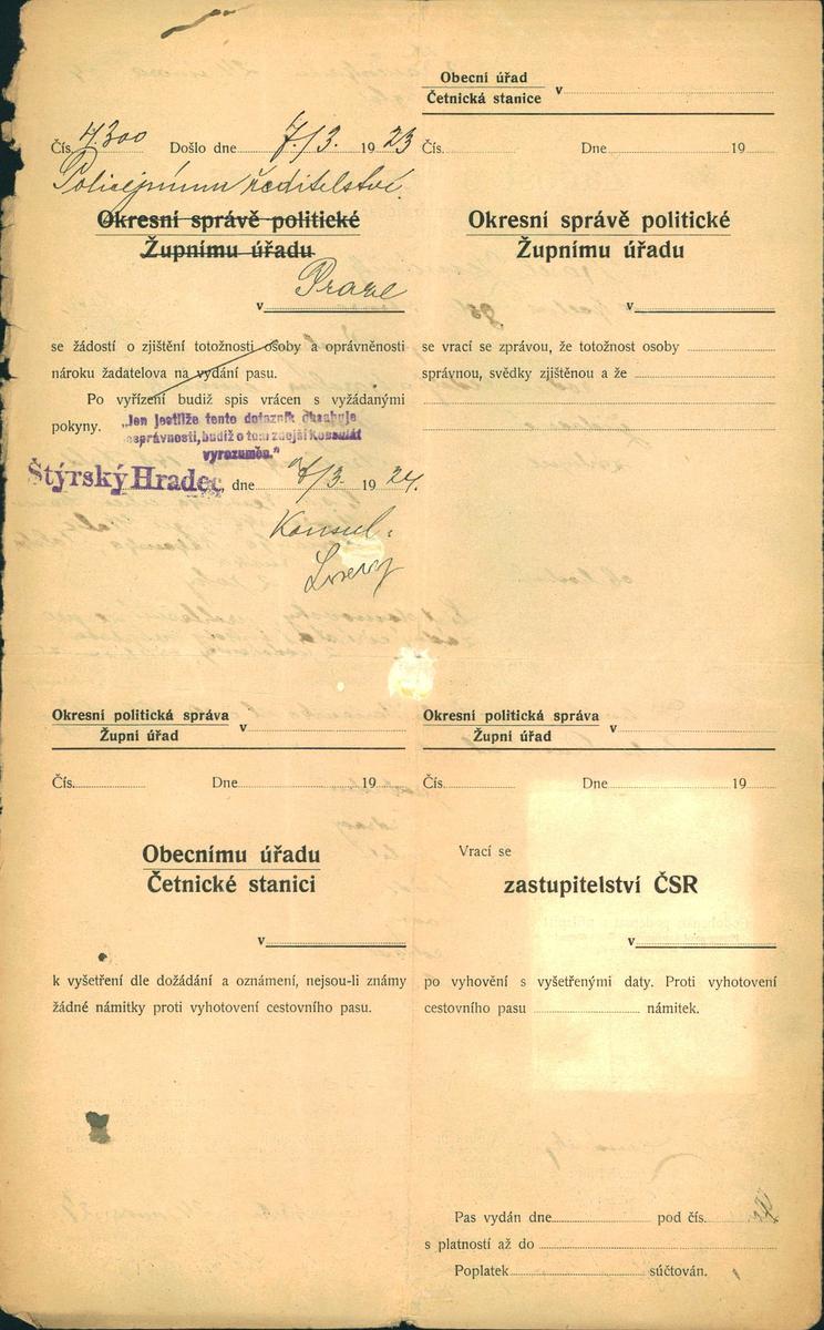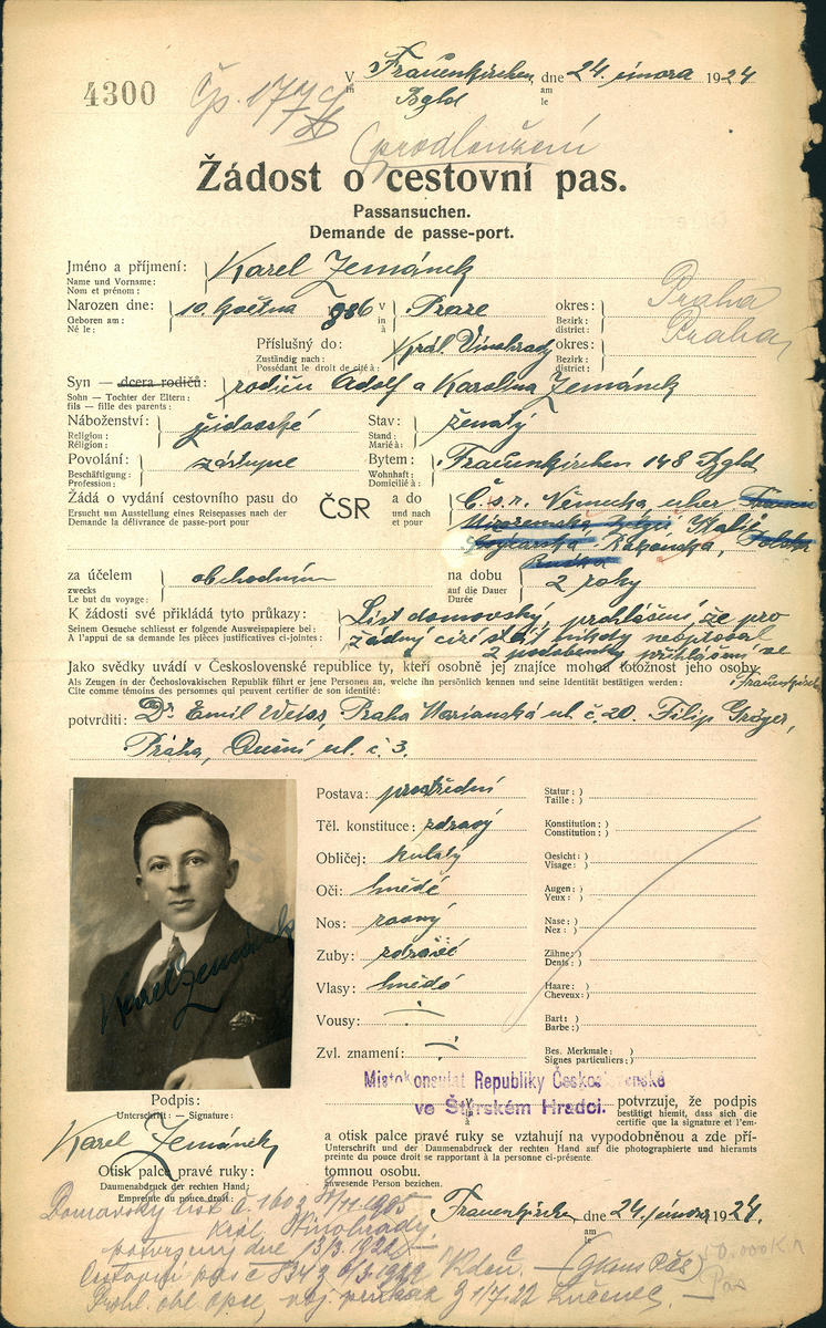 Zemánek Karel: Žádost o vydání cestovního pasu