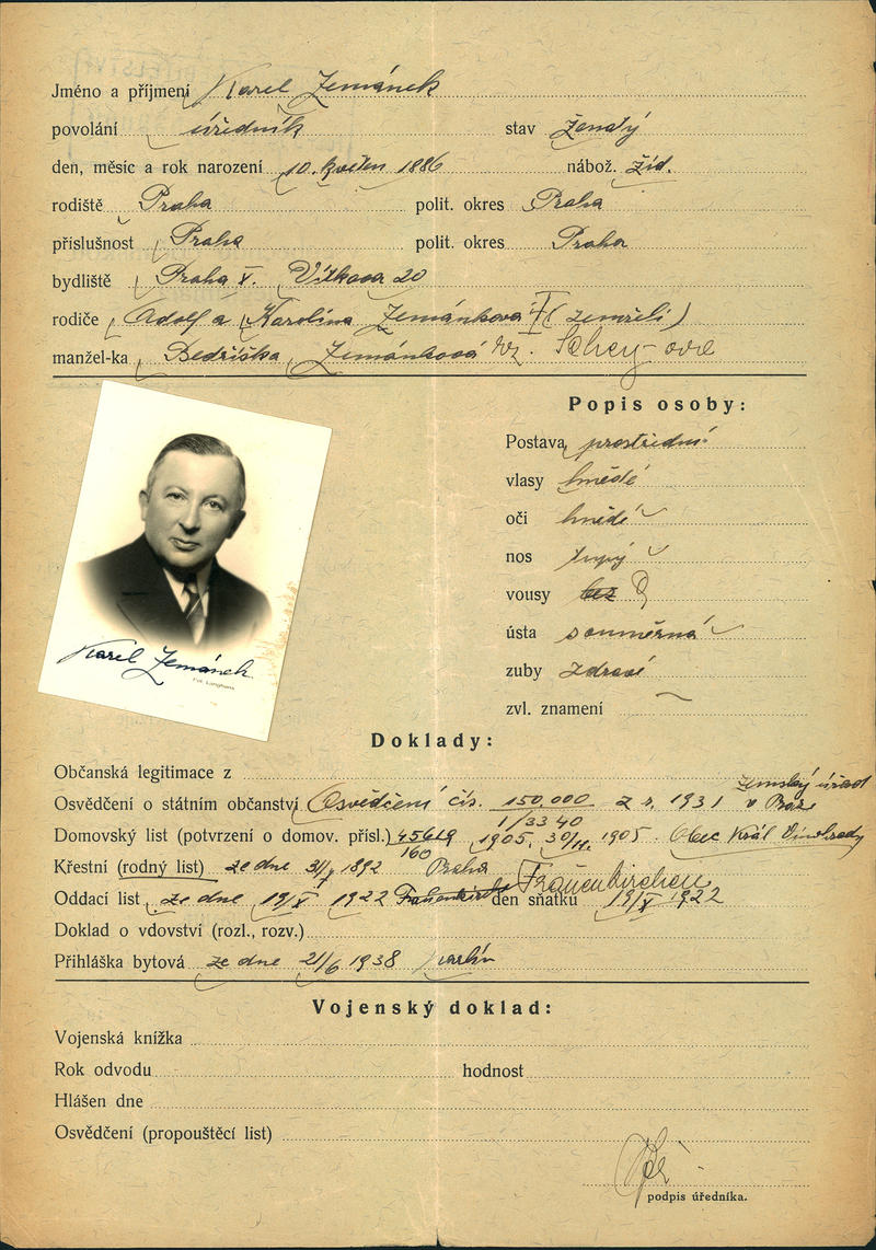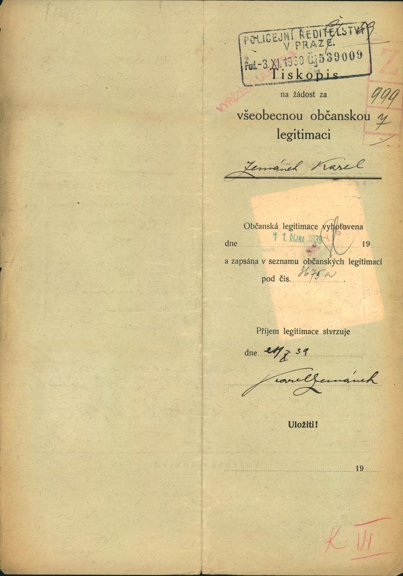 Zemánek Karel: Žádost o vydání občanské legitimace