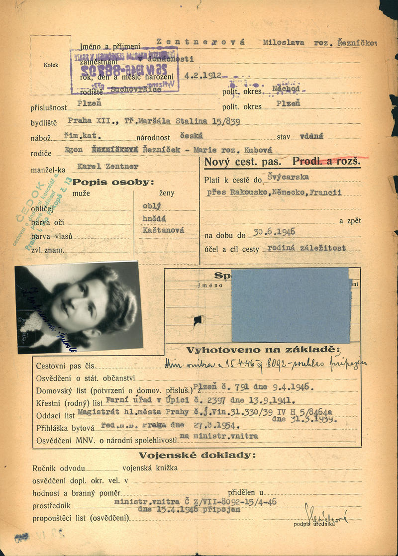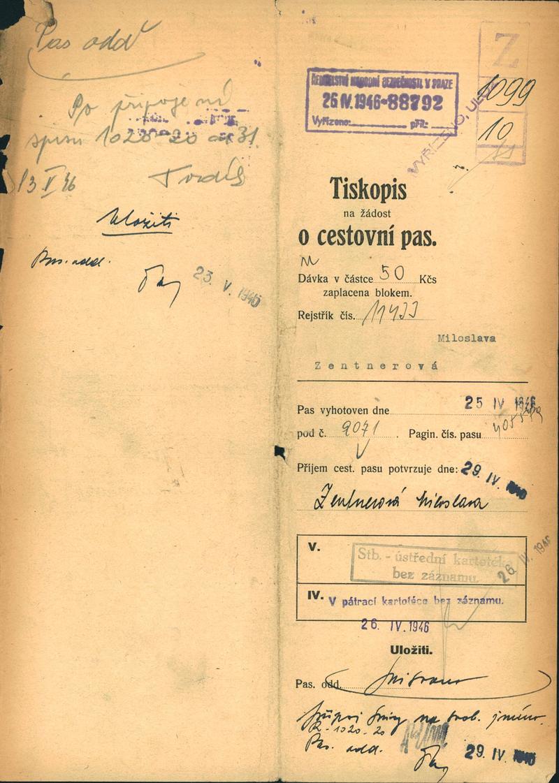 Zentnerová Miloslava: Žádost o vydání cestovního pasu