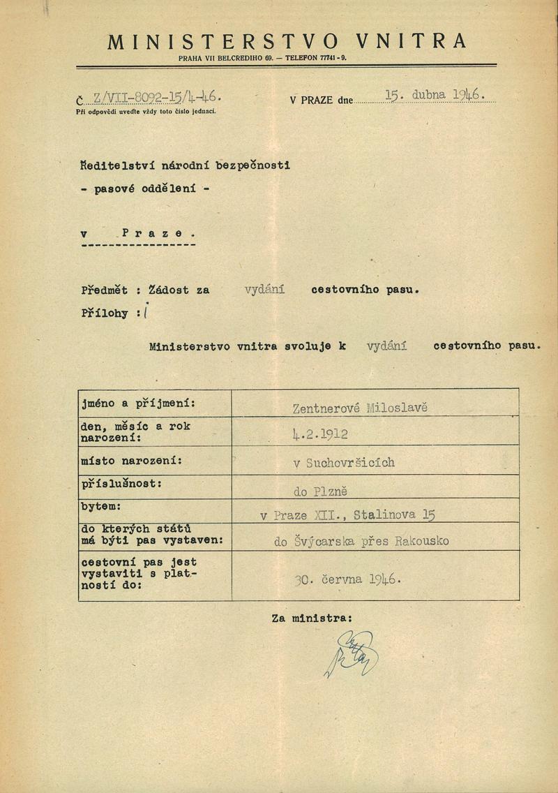 Zentnerová Miloslava: Souhlas s vydáním cestovního pasu