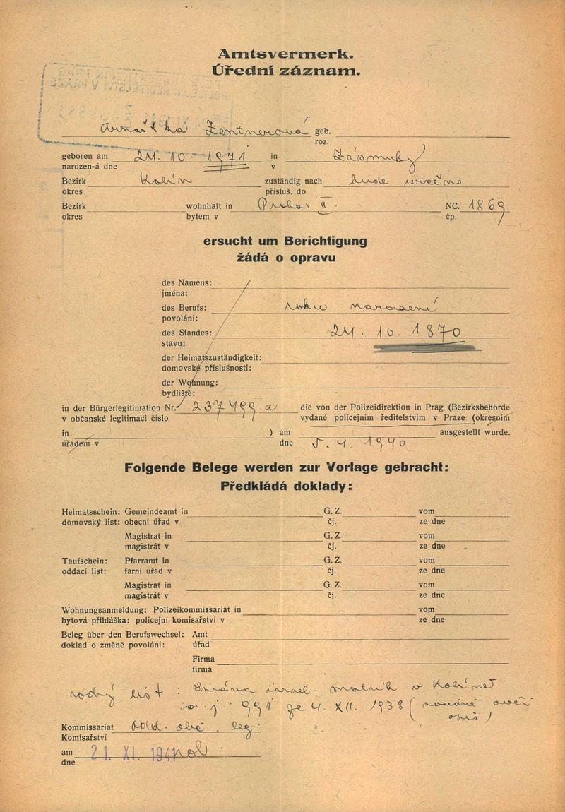 Zentnerová Arnoštka: Žádost o opravu v občanské legitimaci