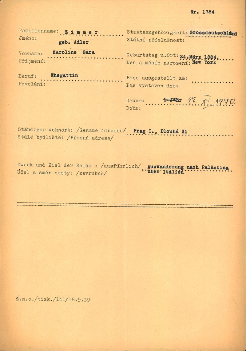 Zimmerová Karoline: Záznam o cestovním pasu