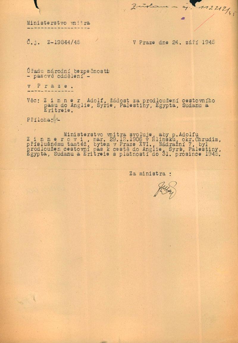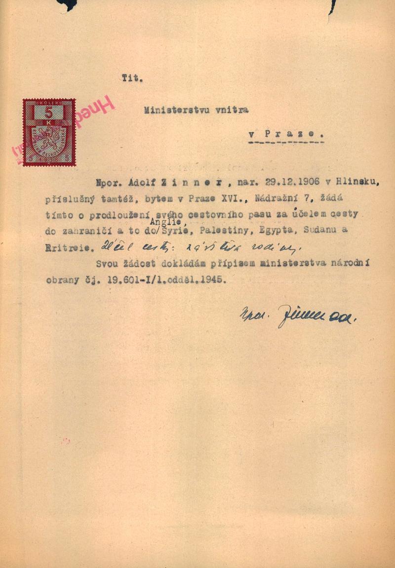 Zinner Adolf: Žádost o prodloužení cestovního pasu
