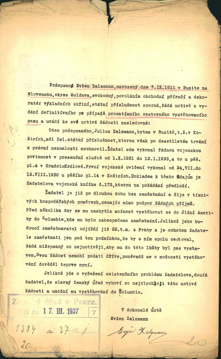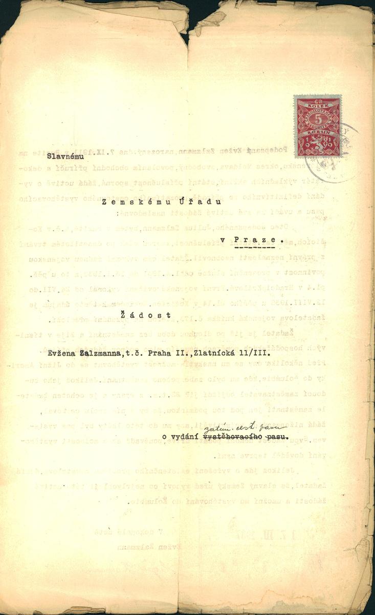 Zalczmann Evžen: Žádost o vydání prozatímního cestovního pasu