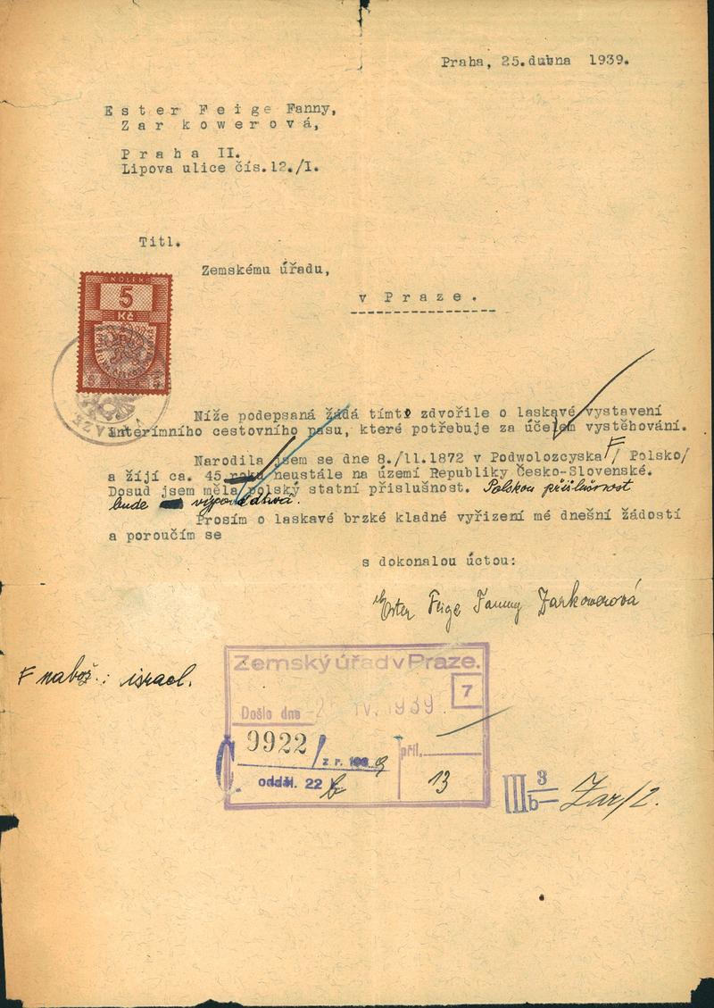 Zarkowerová Ester: Žádost o vydání cestovního pasu