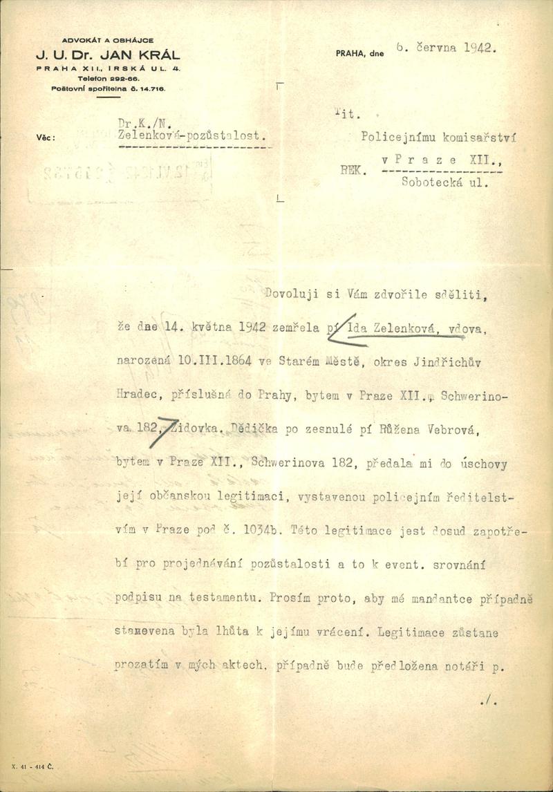 Zellenková Ida: Zpráva o uložení občanské legitimace po zemřelém