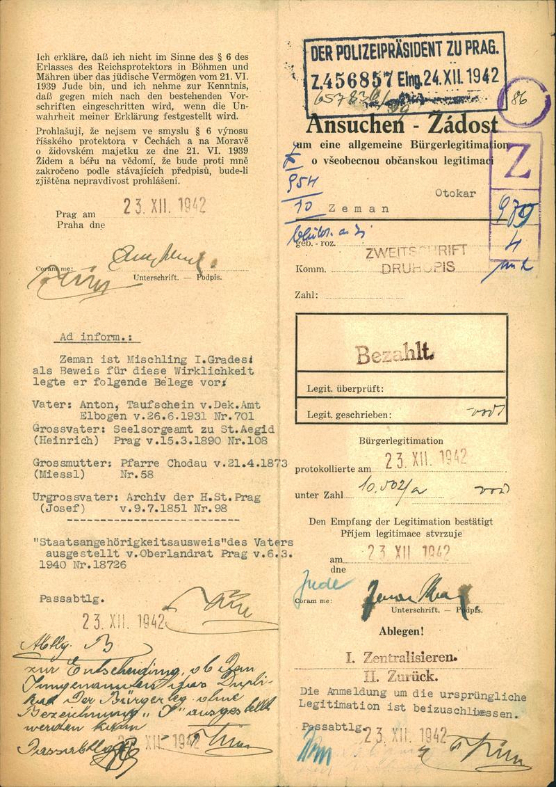 Zeman Otokar: Žádost o vydání občanské legitimace