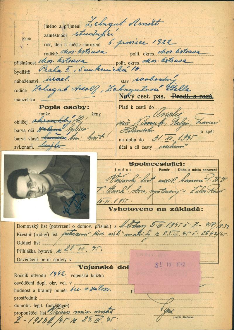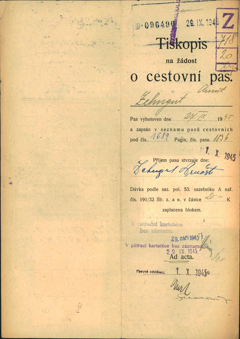 Zehngut Arnošt: Žádost o vydání cestovního pasu
