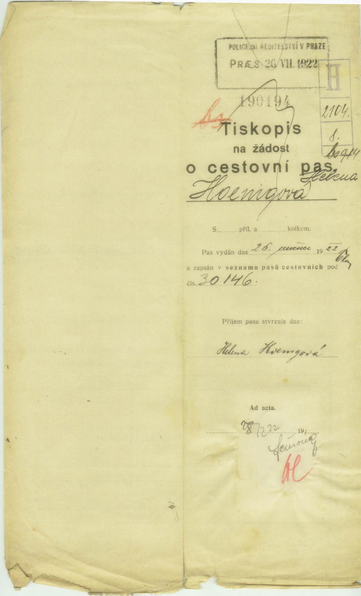 Hoenigová Helena: Žádost o vydání cestovního pasu