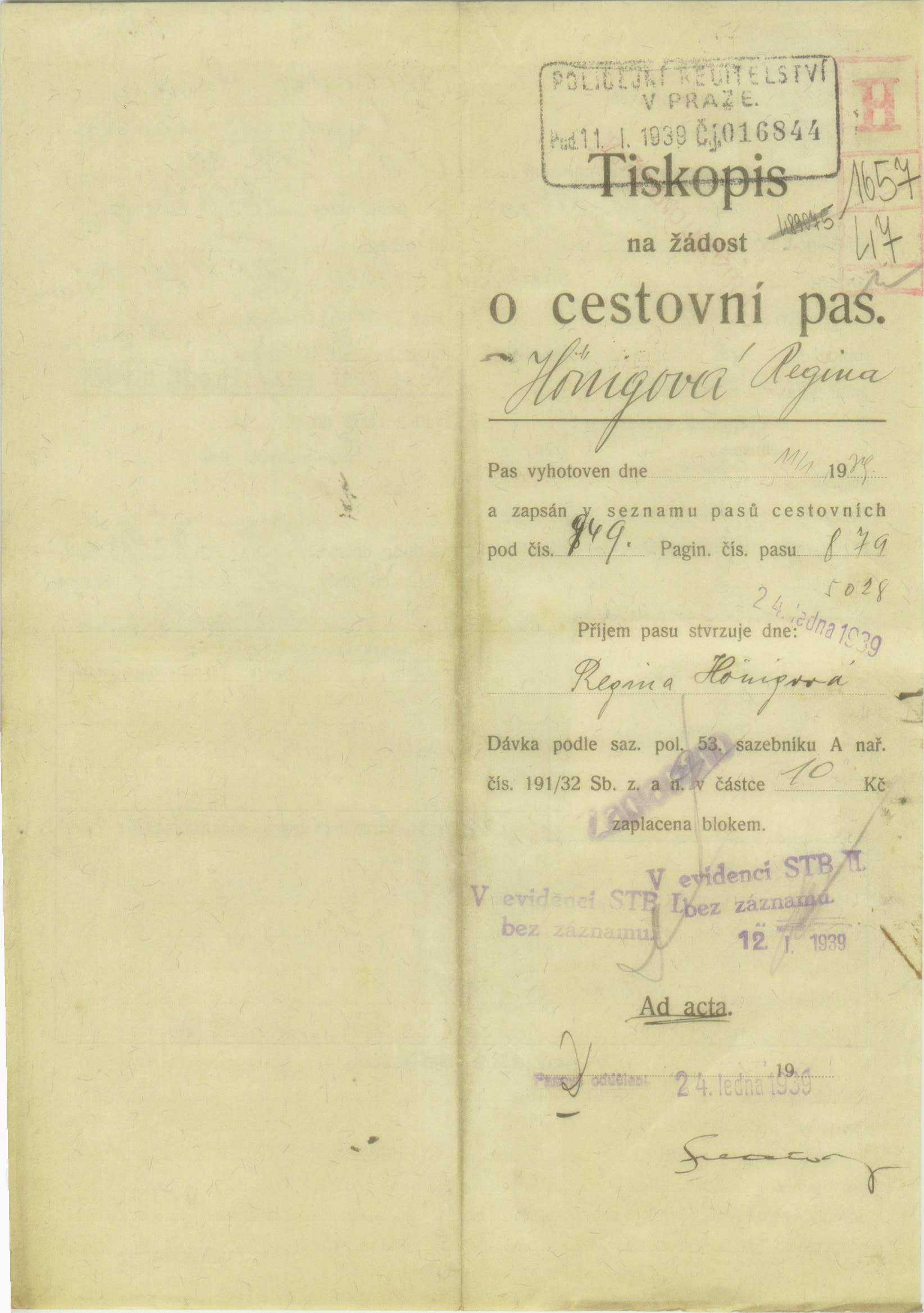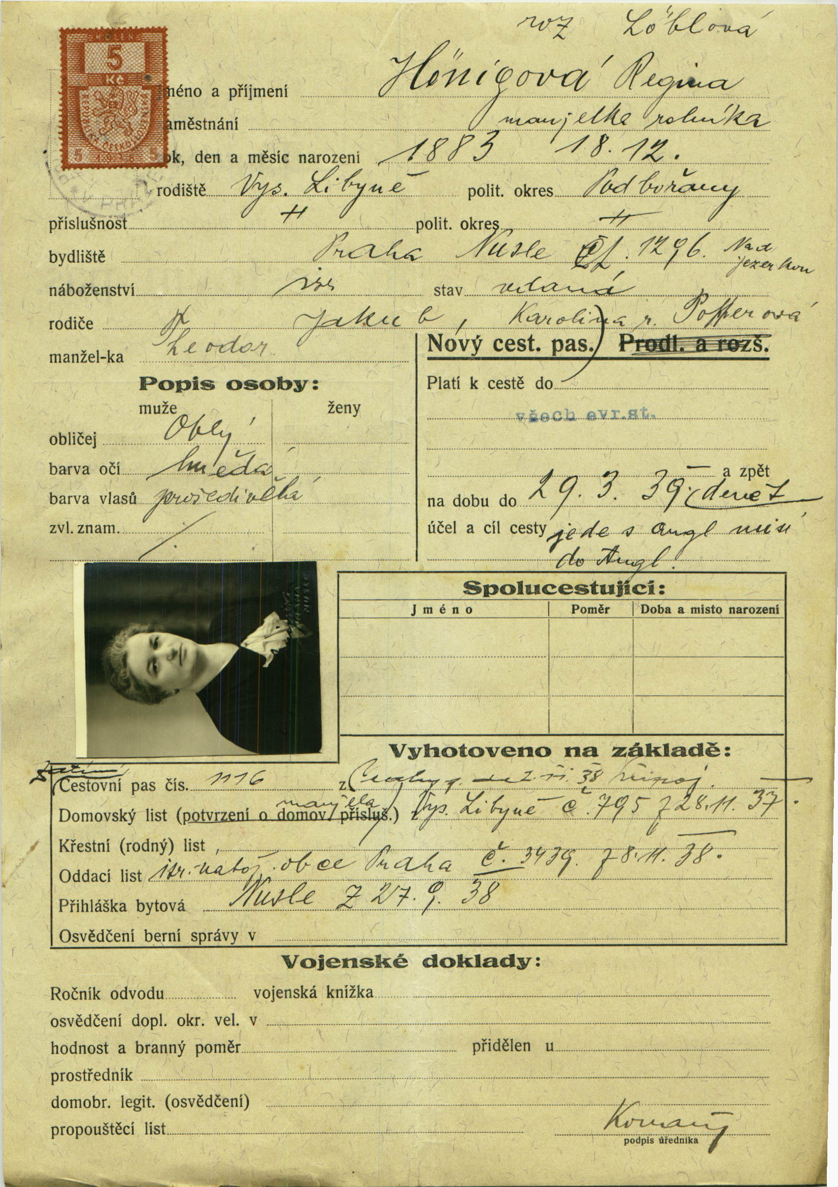 Hönigová Regina: Žádost o vydání cestovního pasu