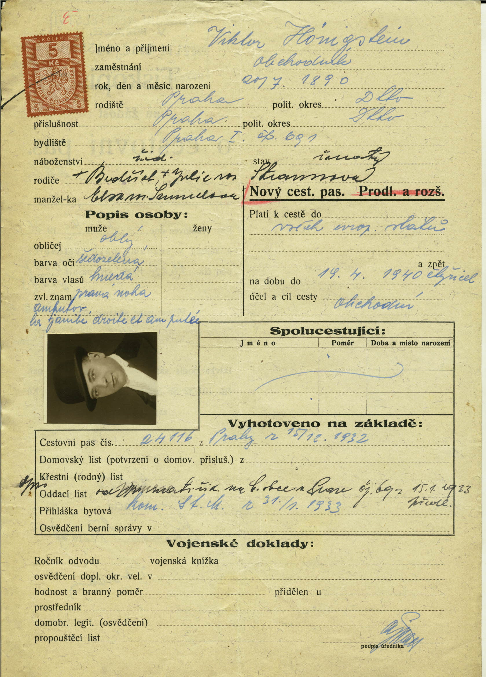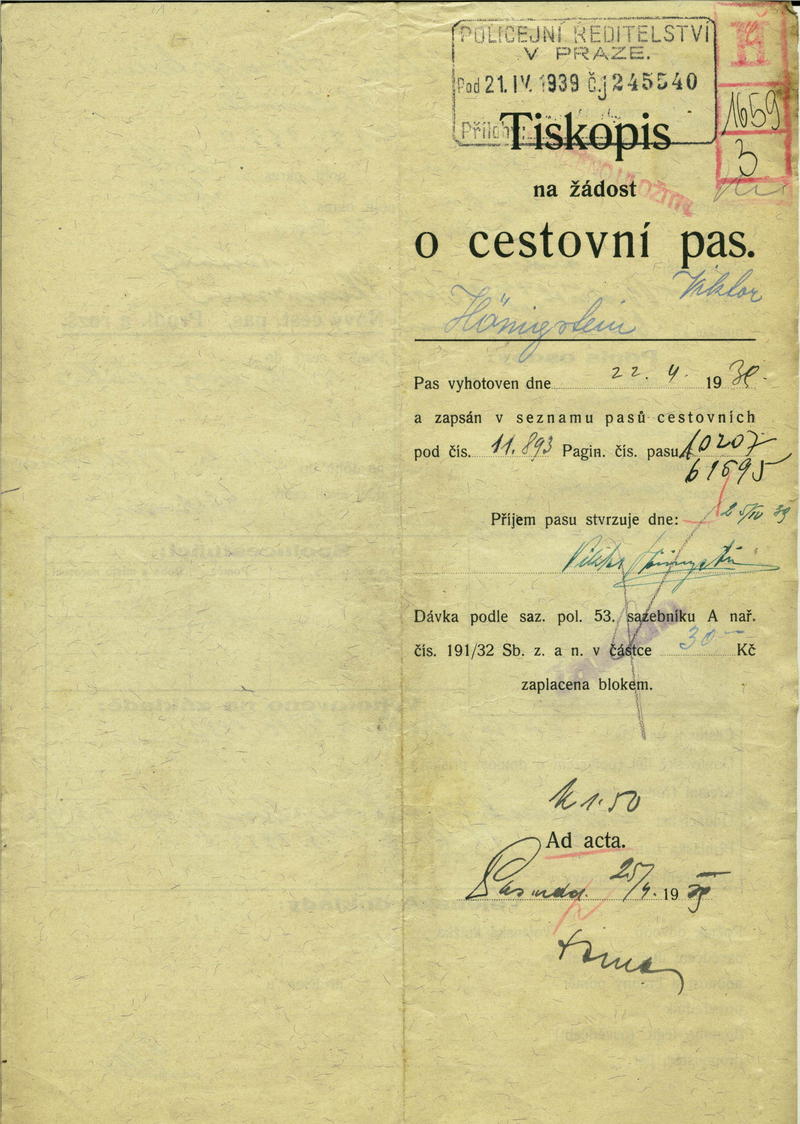 Hönigstein Viktor: Žádost o vydání cestovního pasu