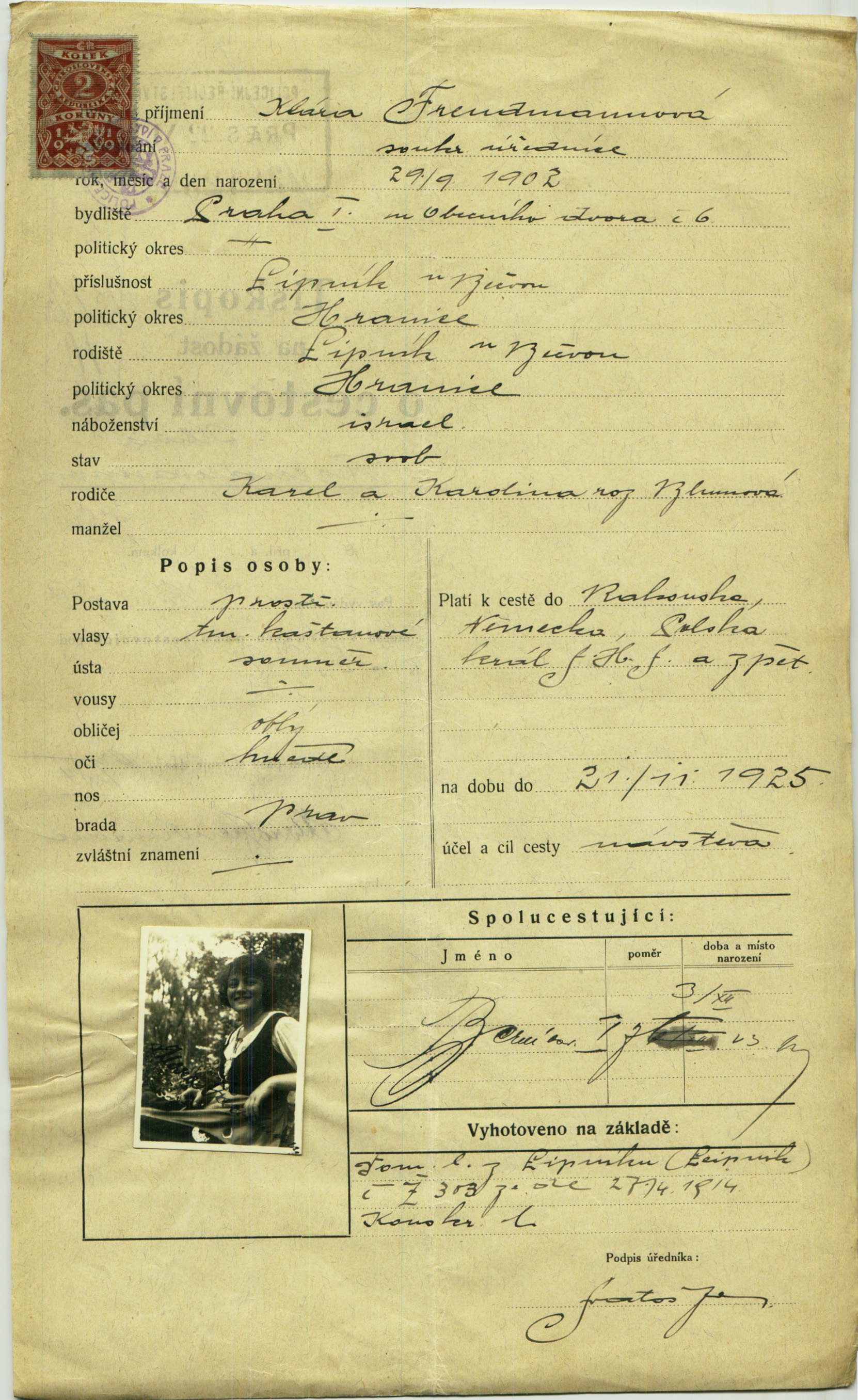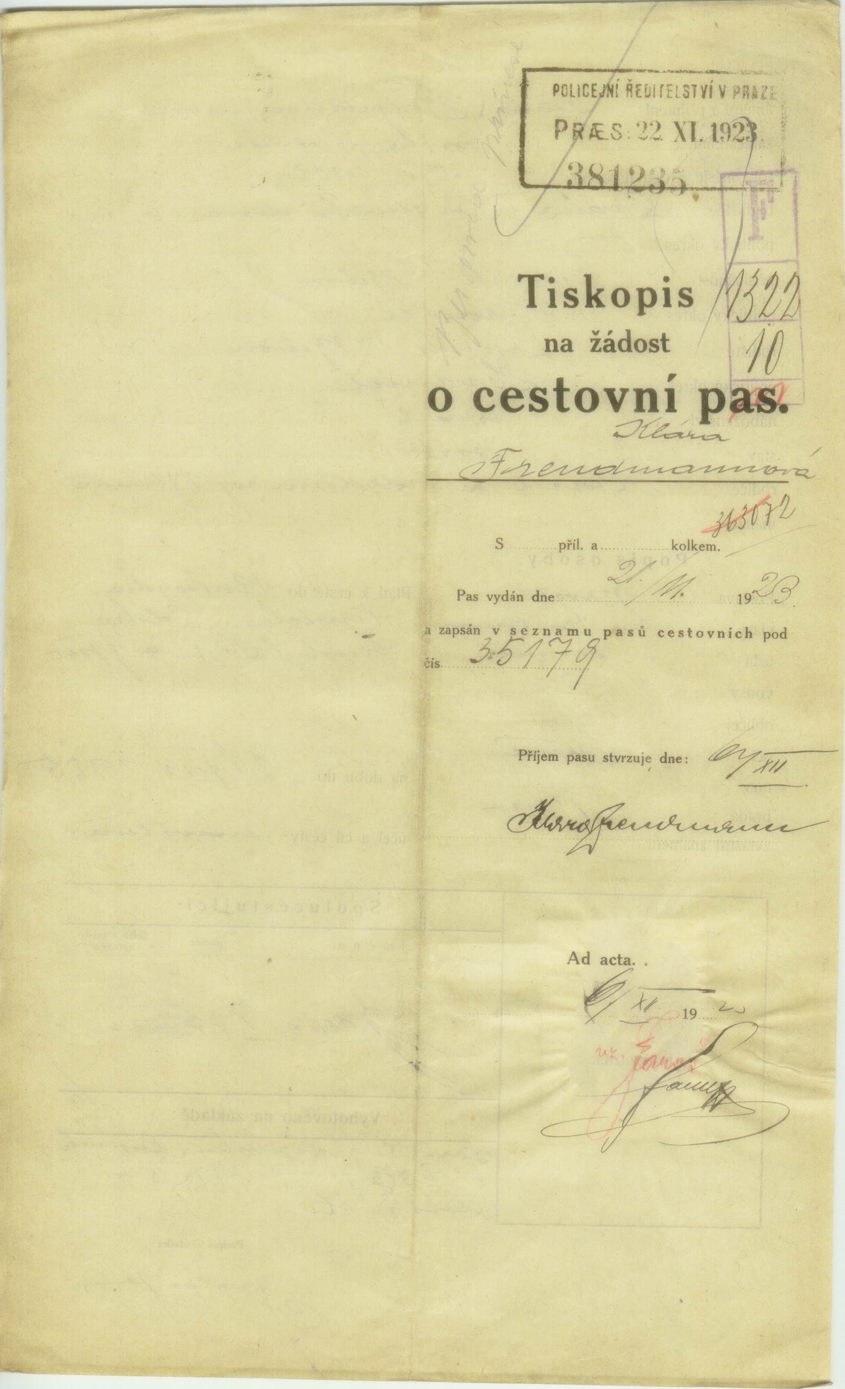 Herzová Klára: Žádost o vydání cestovního pasu