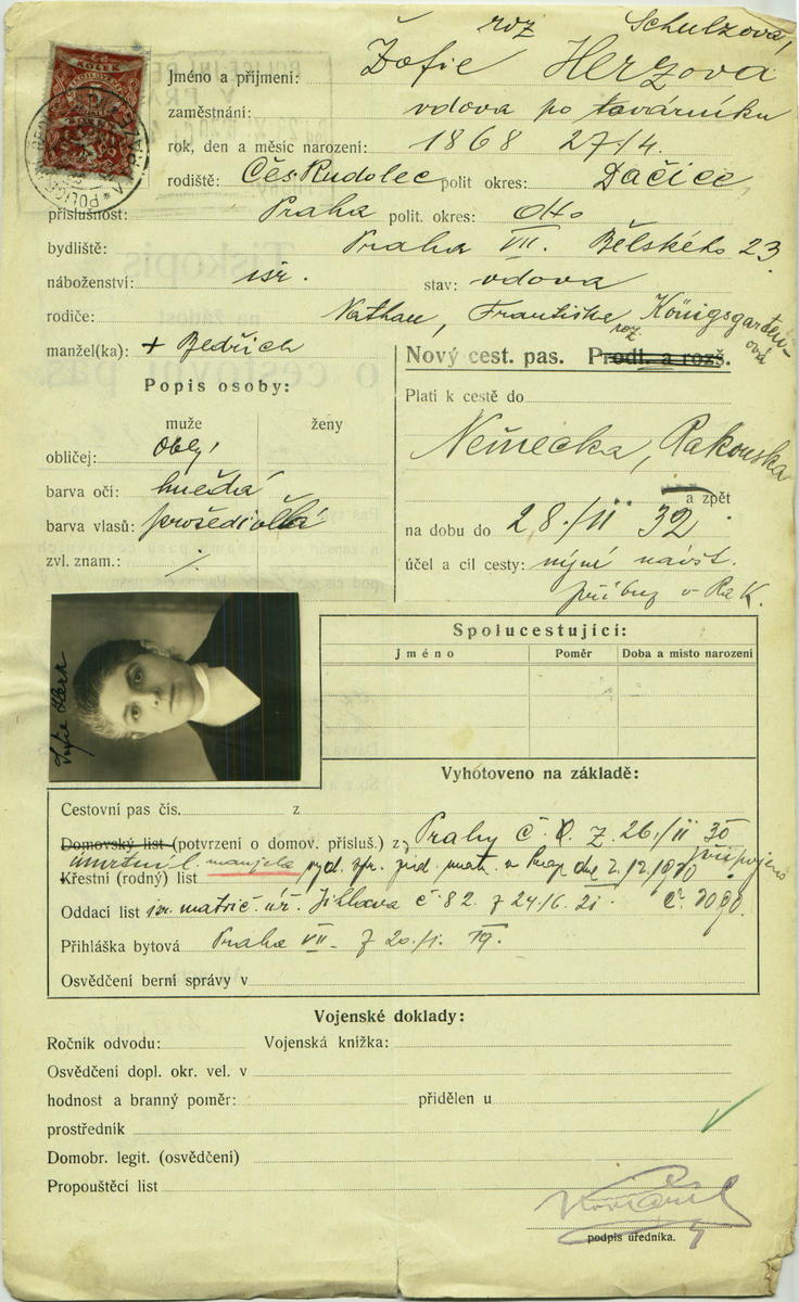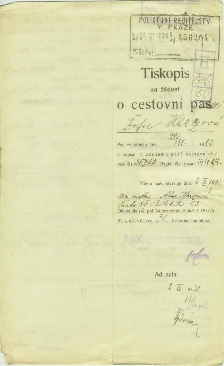 Herzová Žofie: Žádost o vydání cestovního pasu