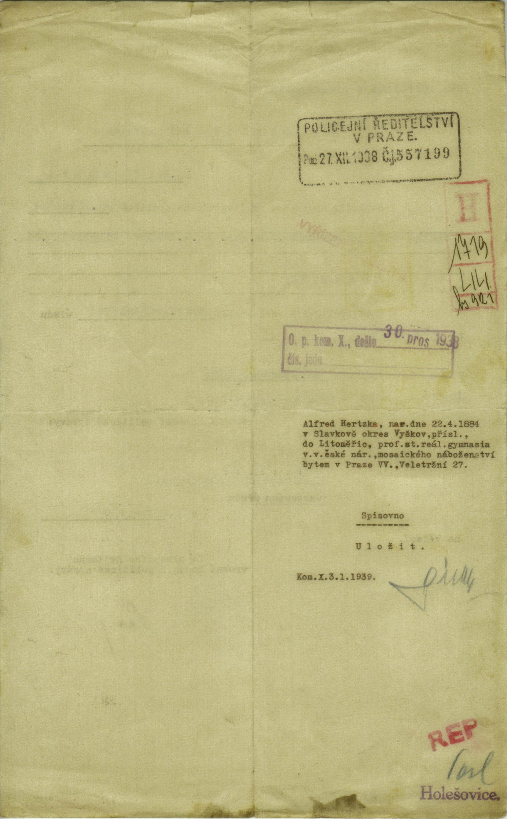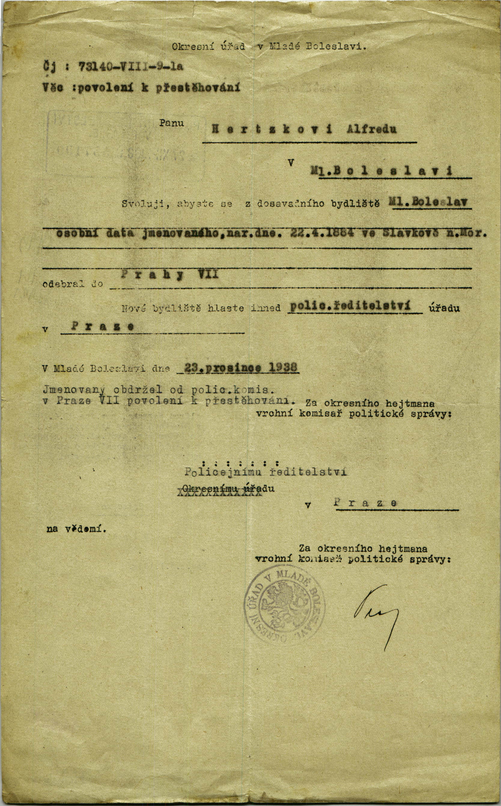 Hertzka Alfred: Povolení k přestěhování