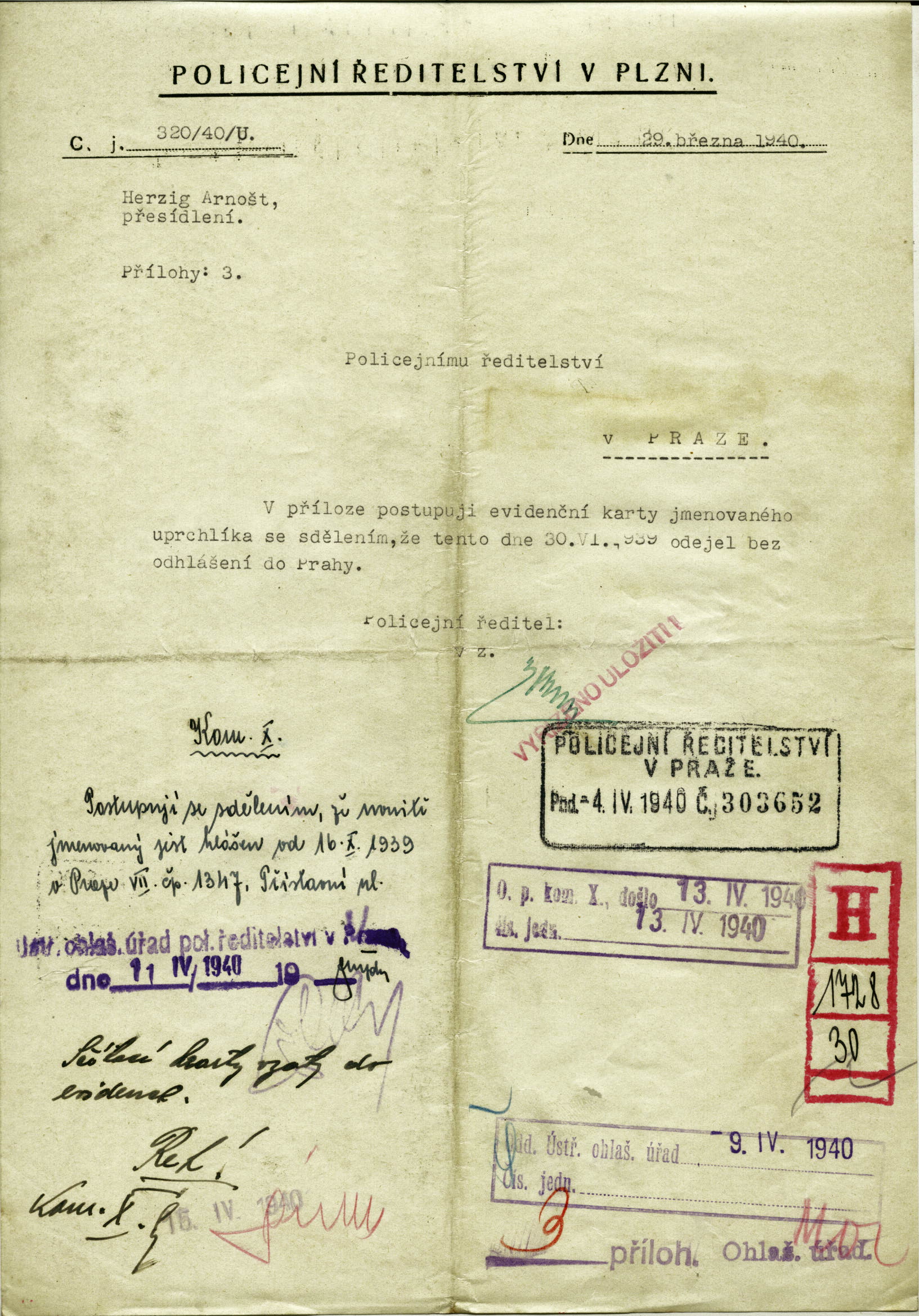 Herzig Ernst: Zpráva o zaslání kartotéčního lístku z evidence uprchlíků
