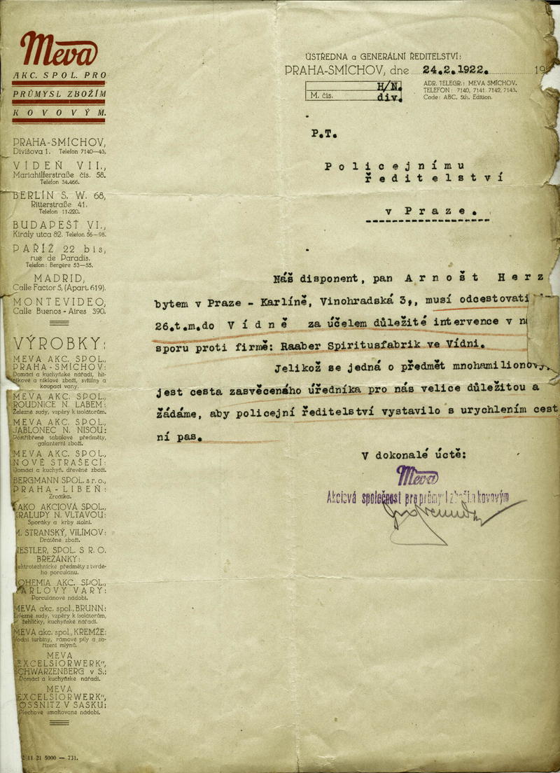 Herzig Arnošt: Žádost o vydání cestovního pasu