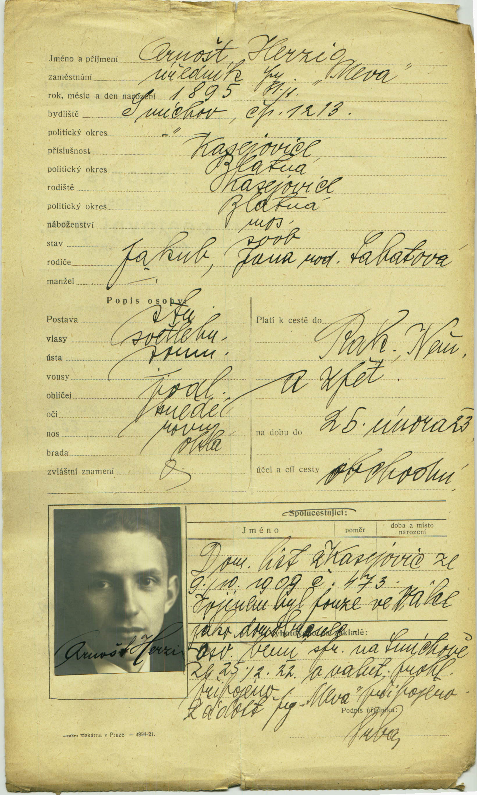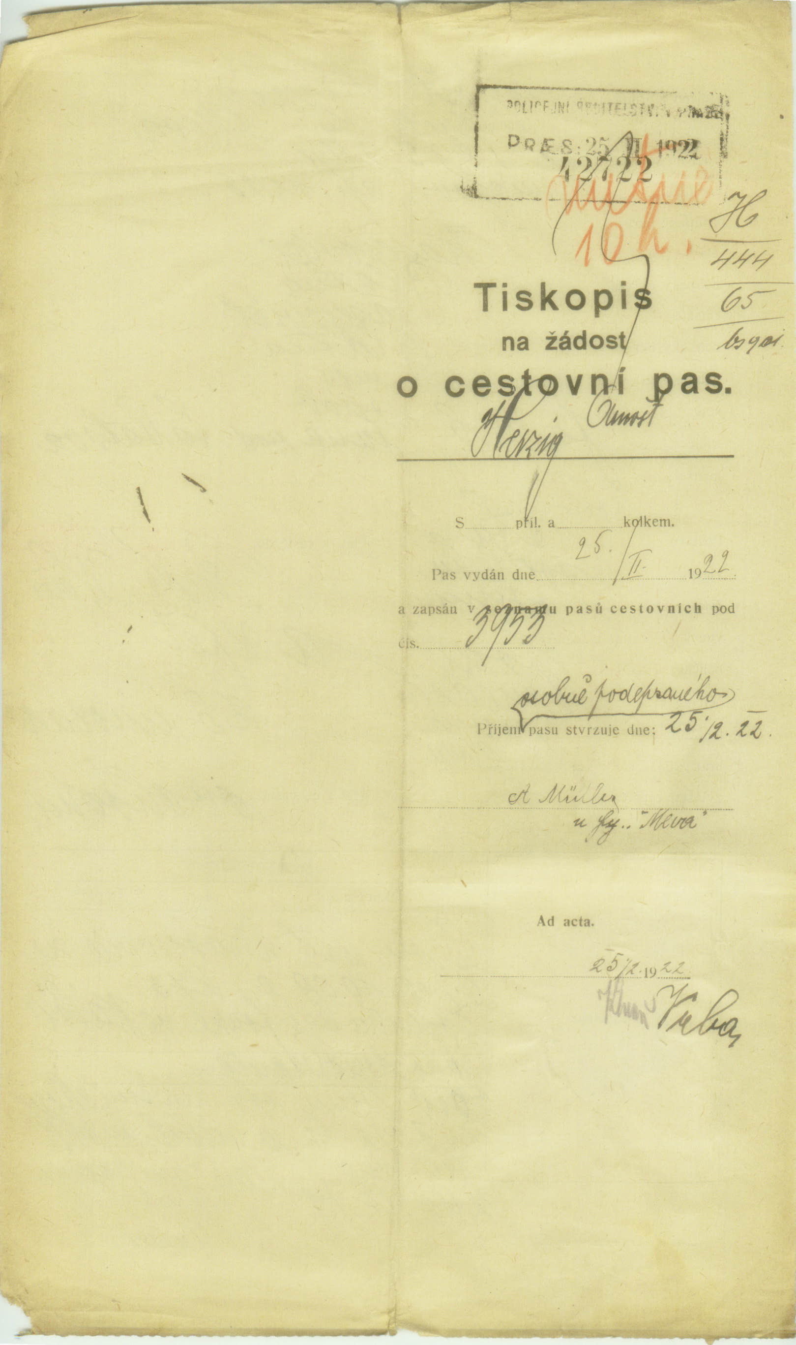 Herzig Arnošt: Žádost o vydání cestovního pasu