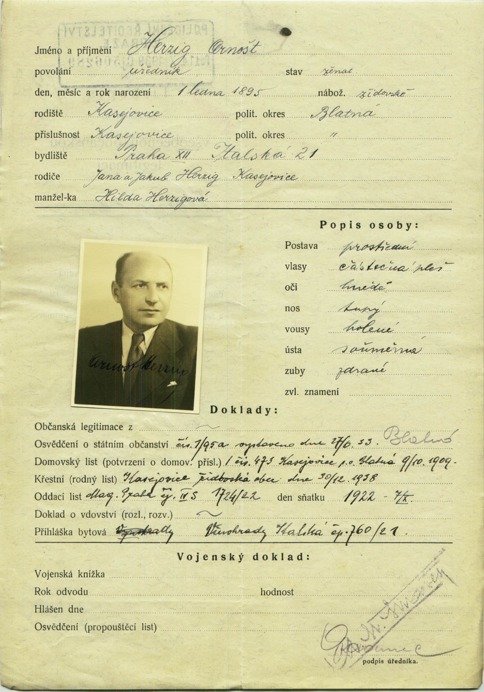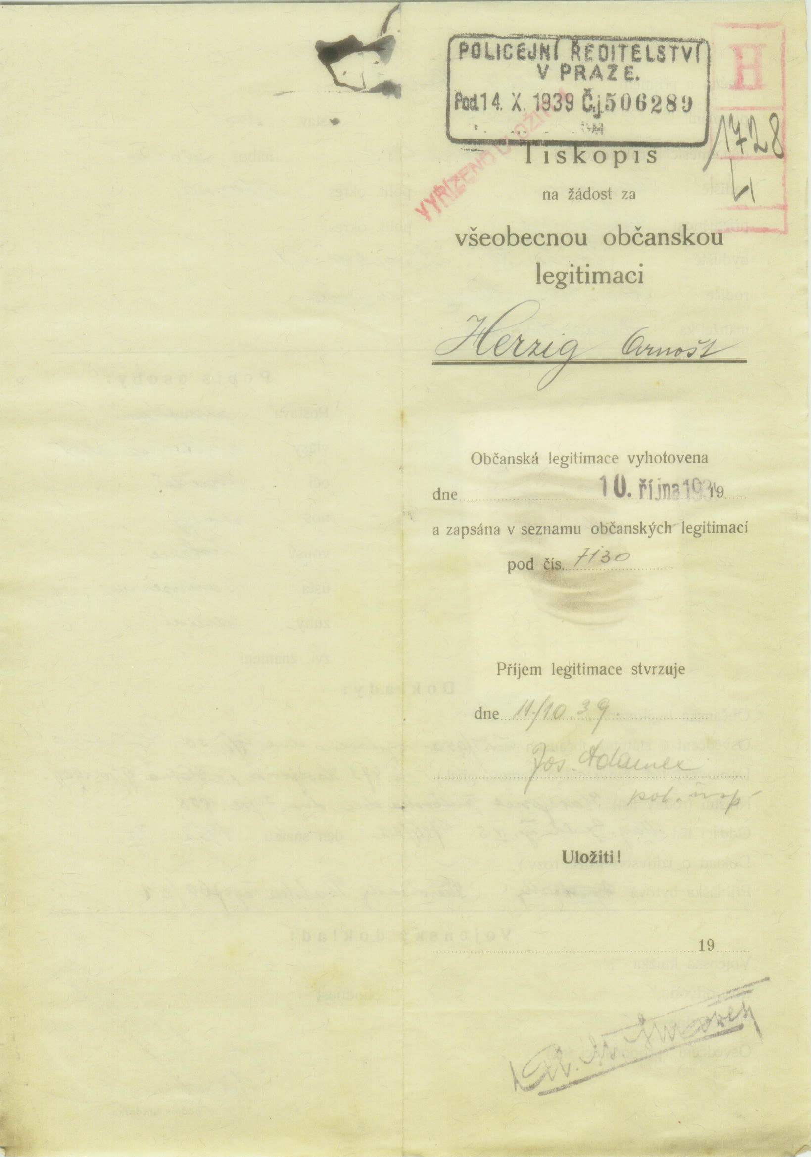 Herzig Arnošt: Žádost o vydání občanské legitimace