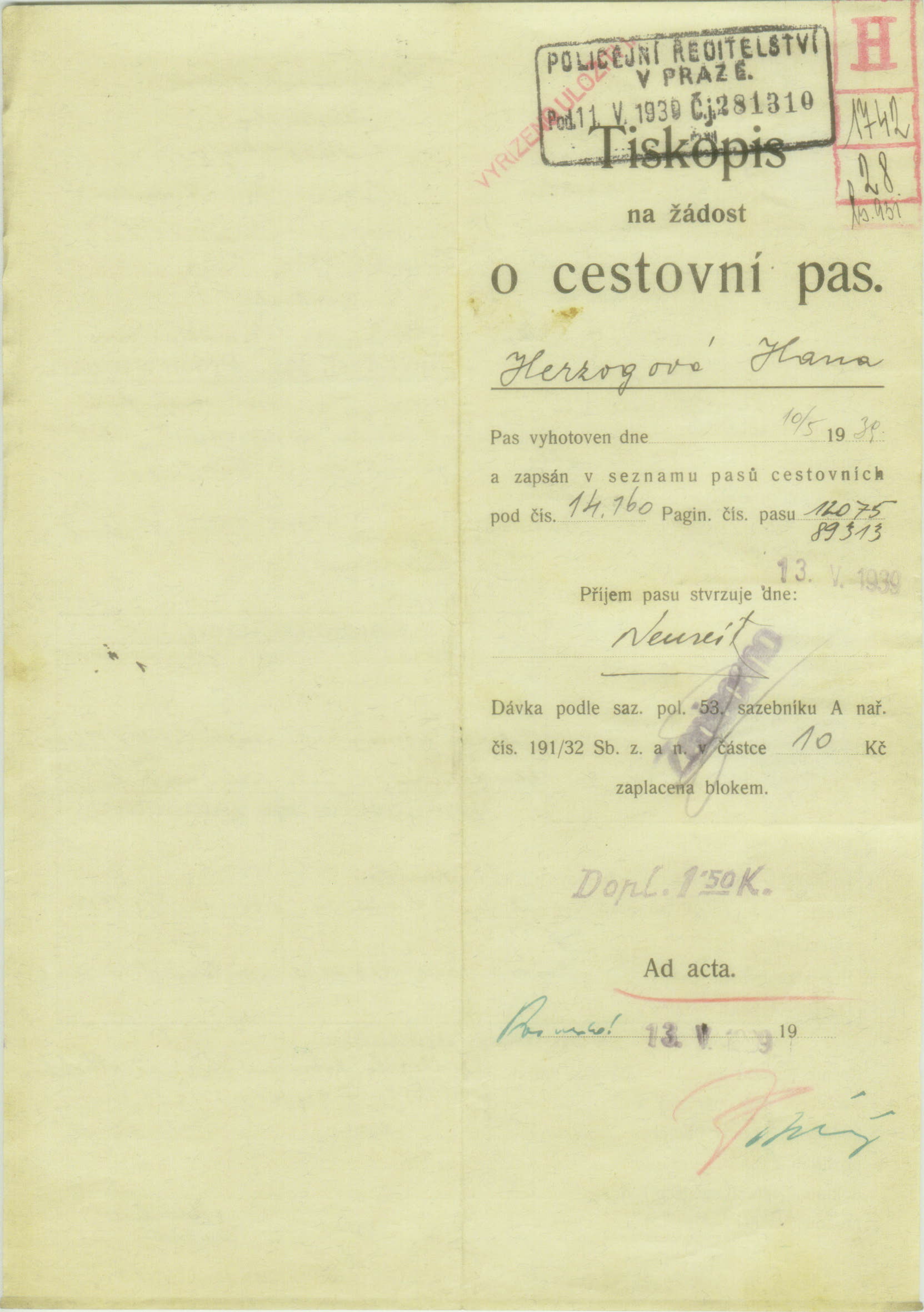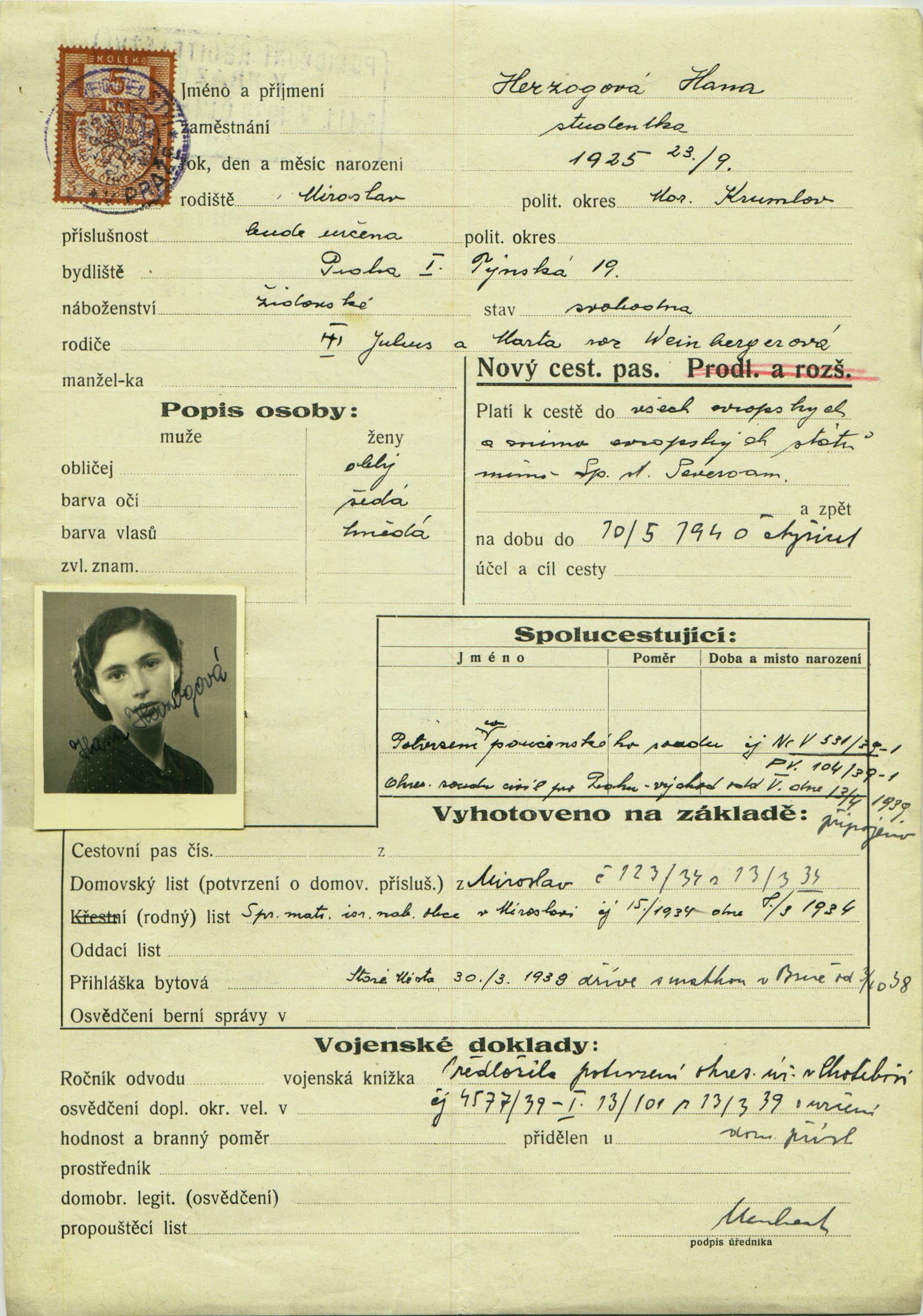 Herzogová Hana: Žádost o vydání cestovního pasu