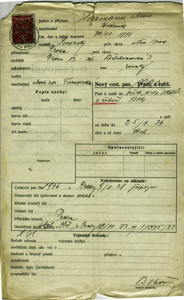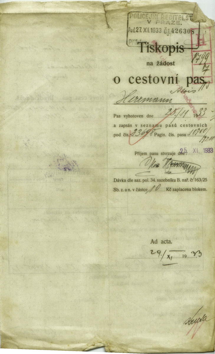 Herrmann Alois: Žádost o vydání cestovního pasu