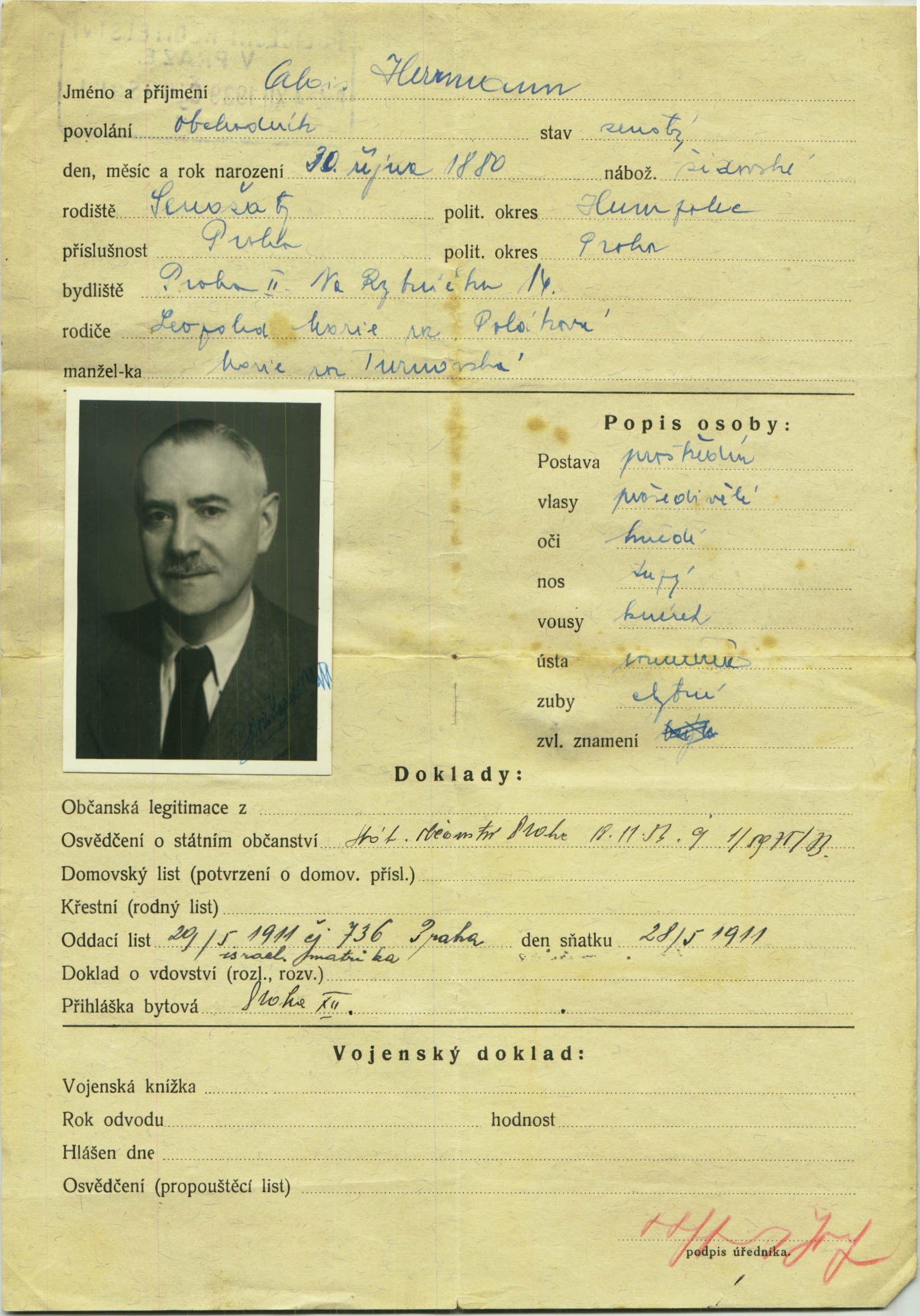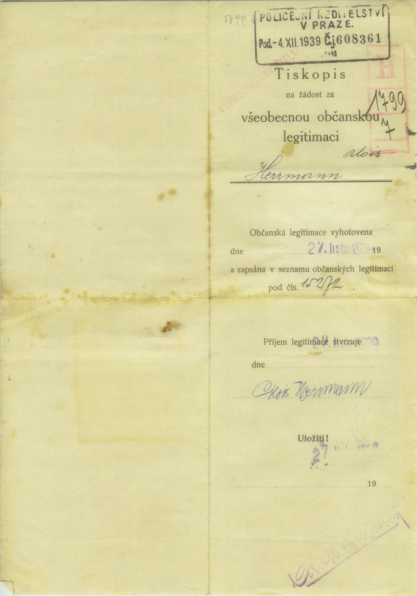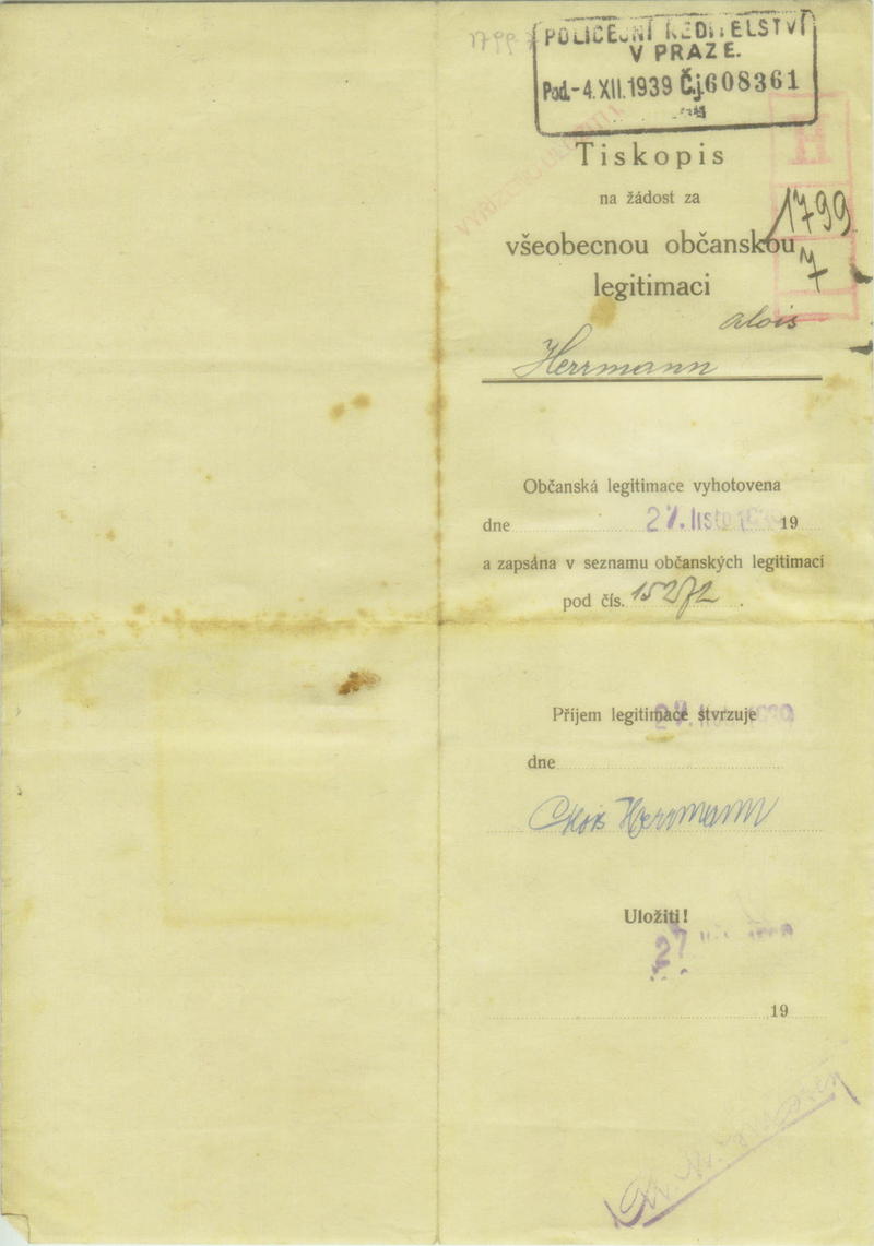 Herrmann Alois: Žádost o vydání občanské legitimace