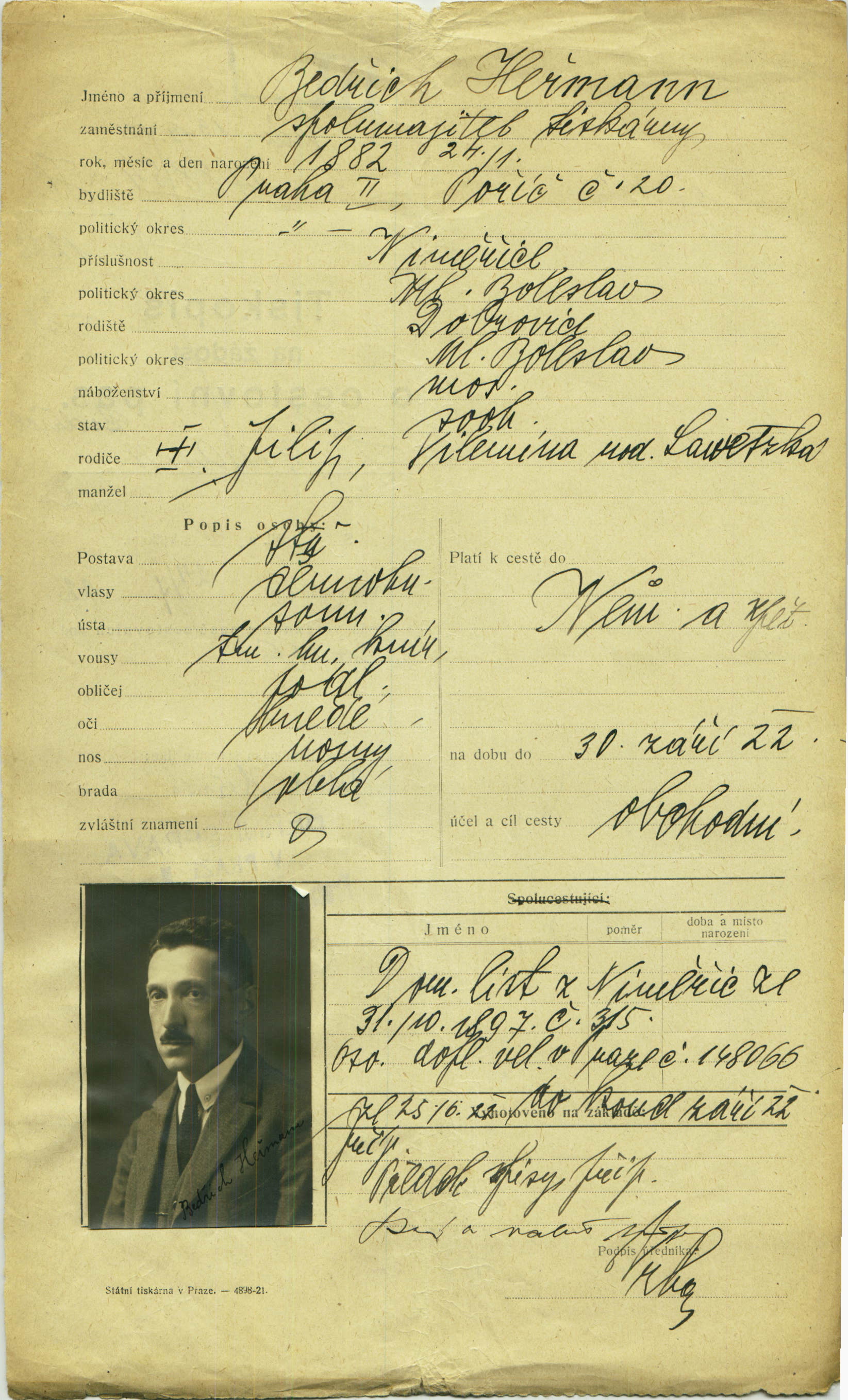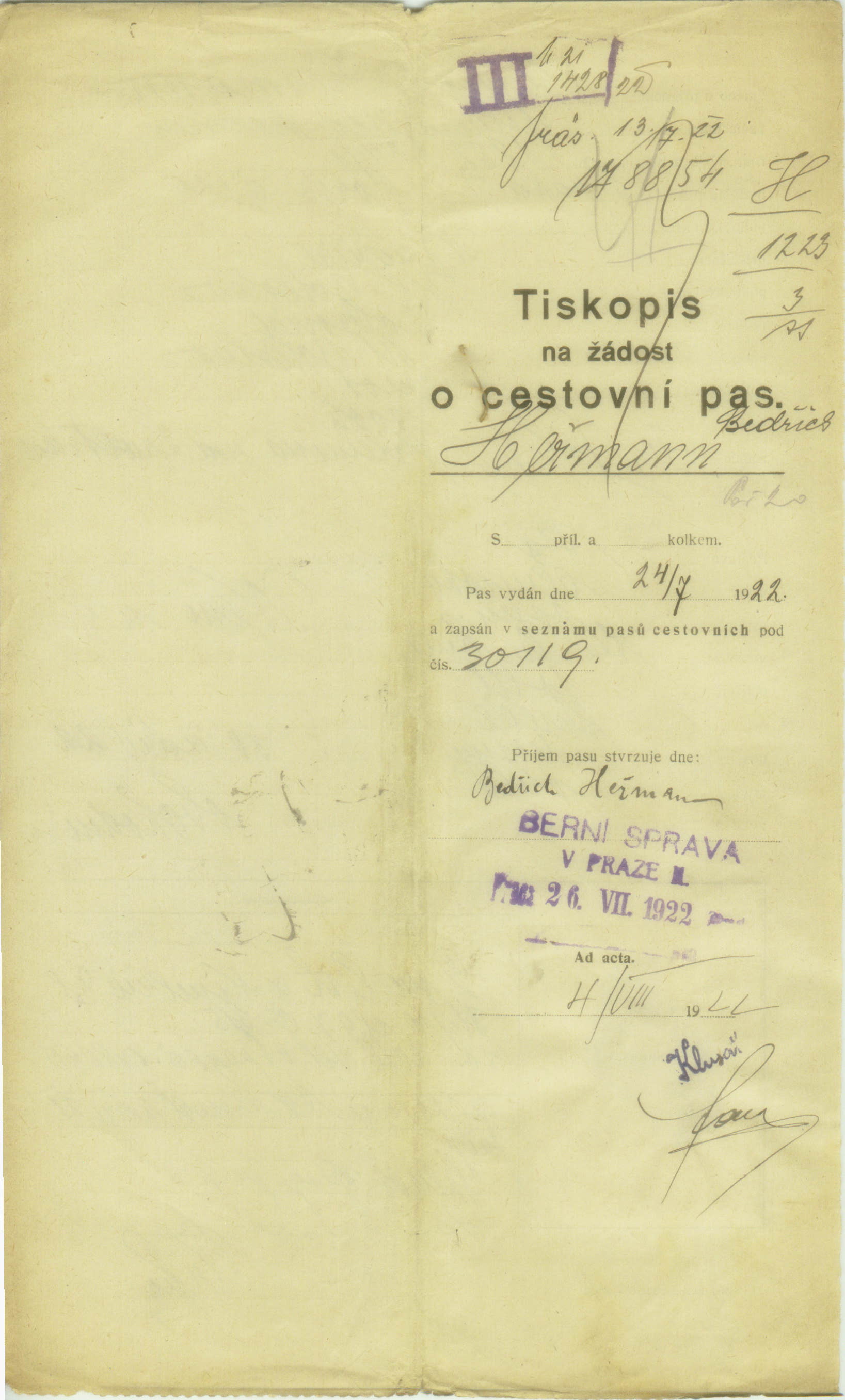 Heřmann Bedřich: Žádost o vystavení cestovního pasu