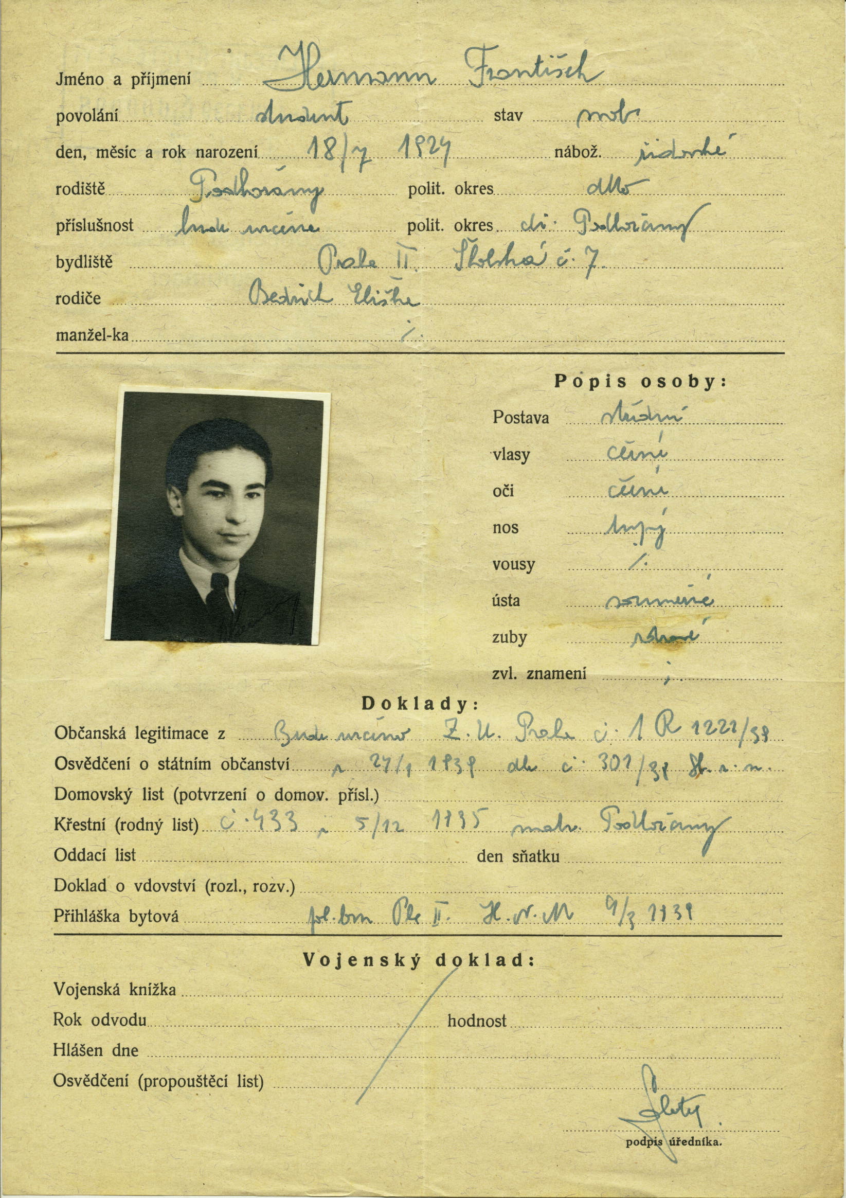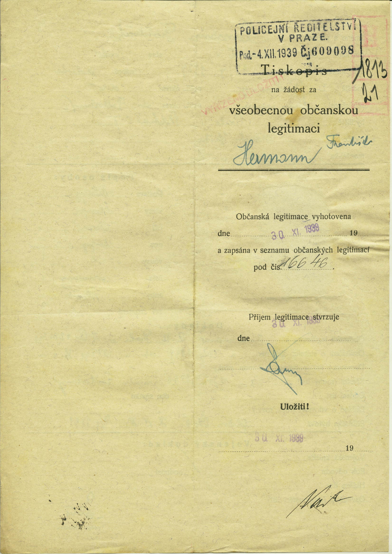 Hermann František: Žádost o vydání občanské legitimace