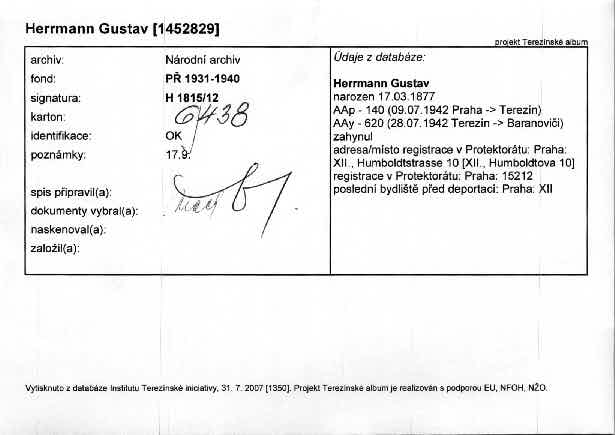 This database contains the names and fates of those who were deported from the territory of today’s Czech Republic, be it their homeland or may they have been deported to the Theresienstadt ghetto before from different european countries. Further, it contains basic information on those men, women and children, most of whom were Roma or Sinti, who died as prisoners of the so-called „Gypsy camp I“ Lety u Písku.