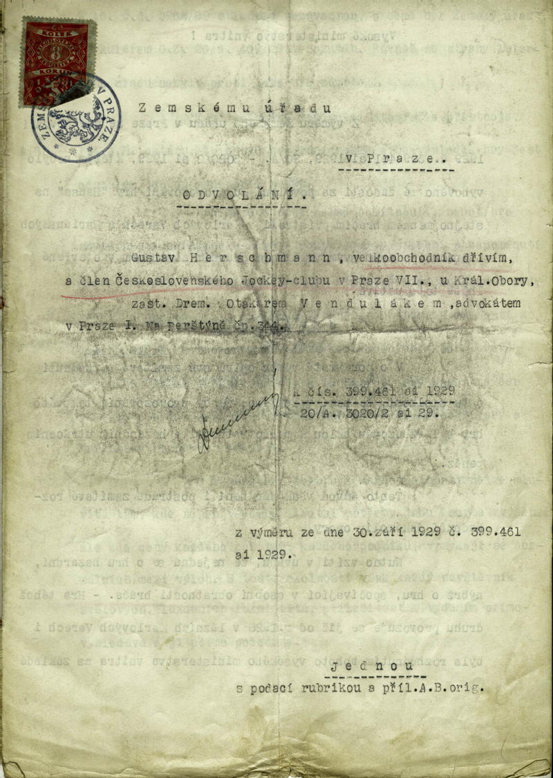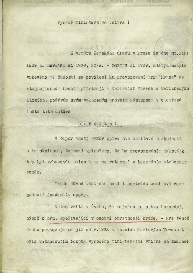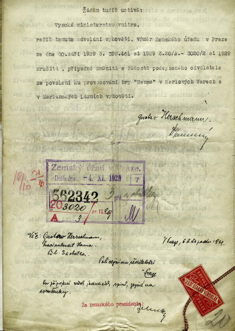 Herschmann Gustav: Odvolání proti zamítnutí provozování hry "Hansa"