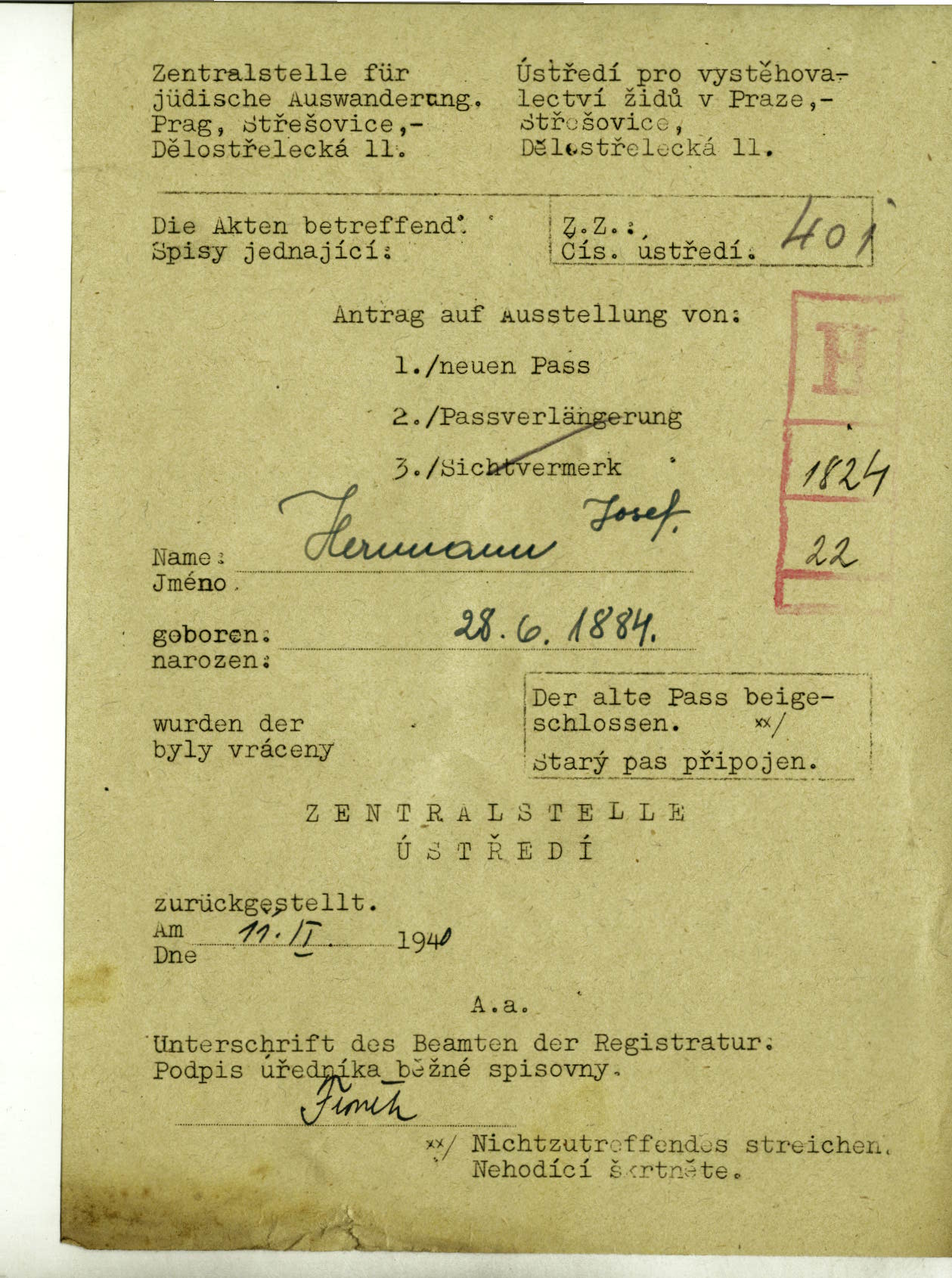 Herrmann Josef: Záznam o vrácení spisu Zentralstelle