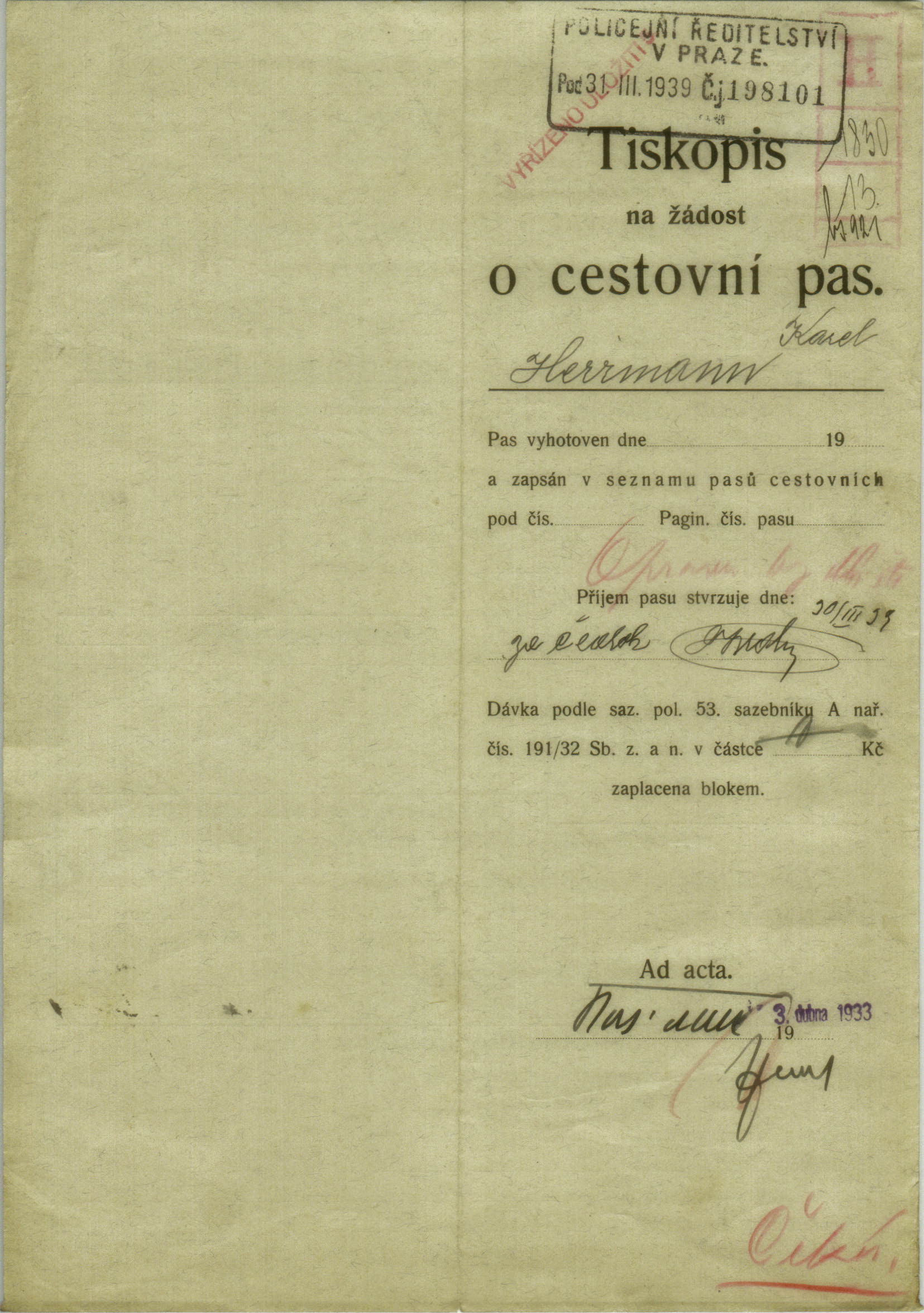Herrmann Karel: Žádost o opravu v cestovním pase