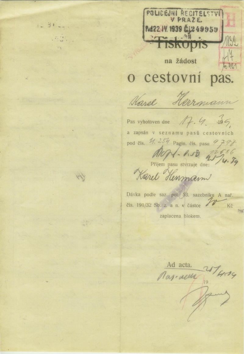 Herrmann Karel: Žádost o vydání cestovního pasu