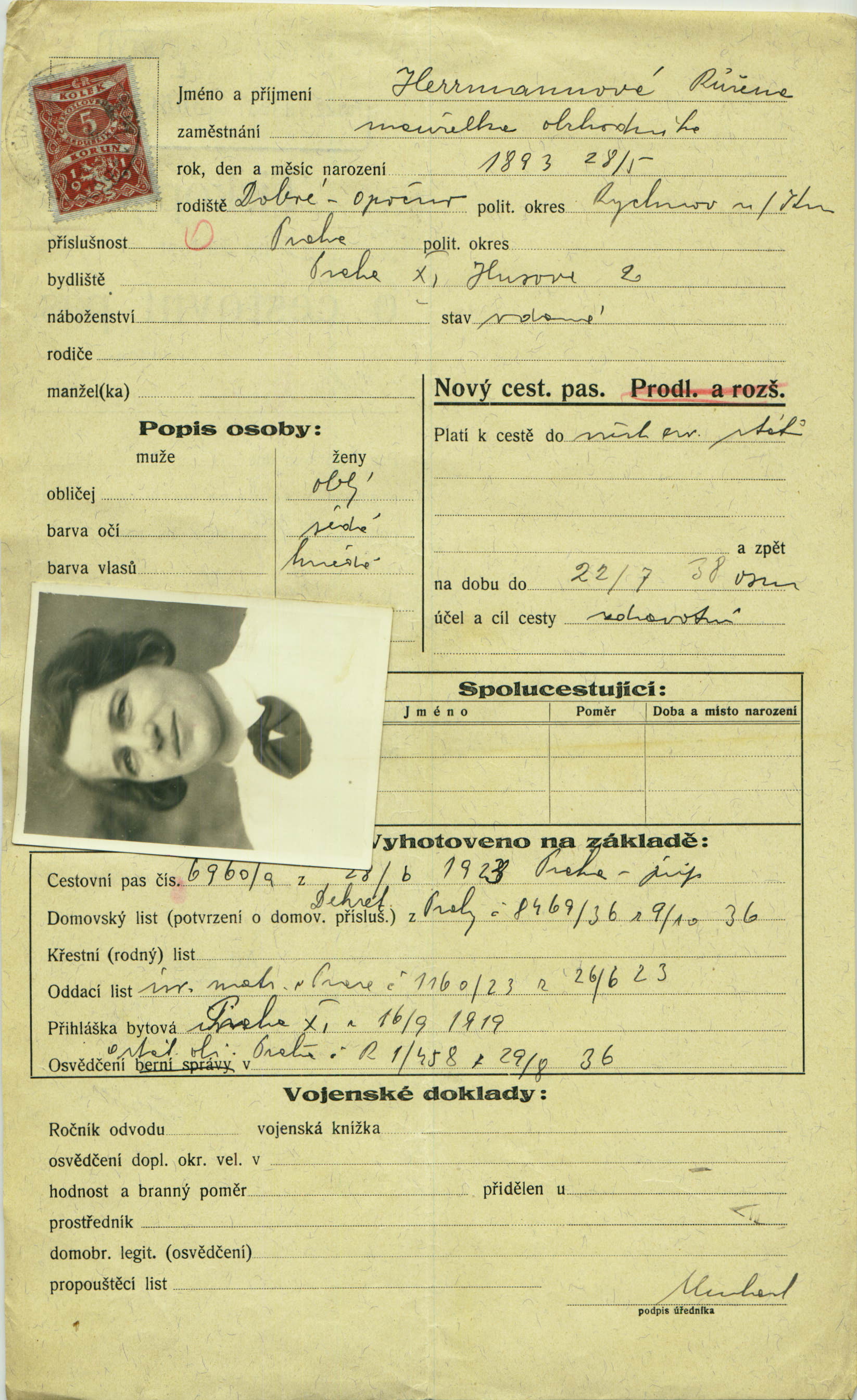 Herrmannová Růžena: Žádost o vydání cestovního pasu