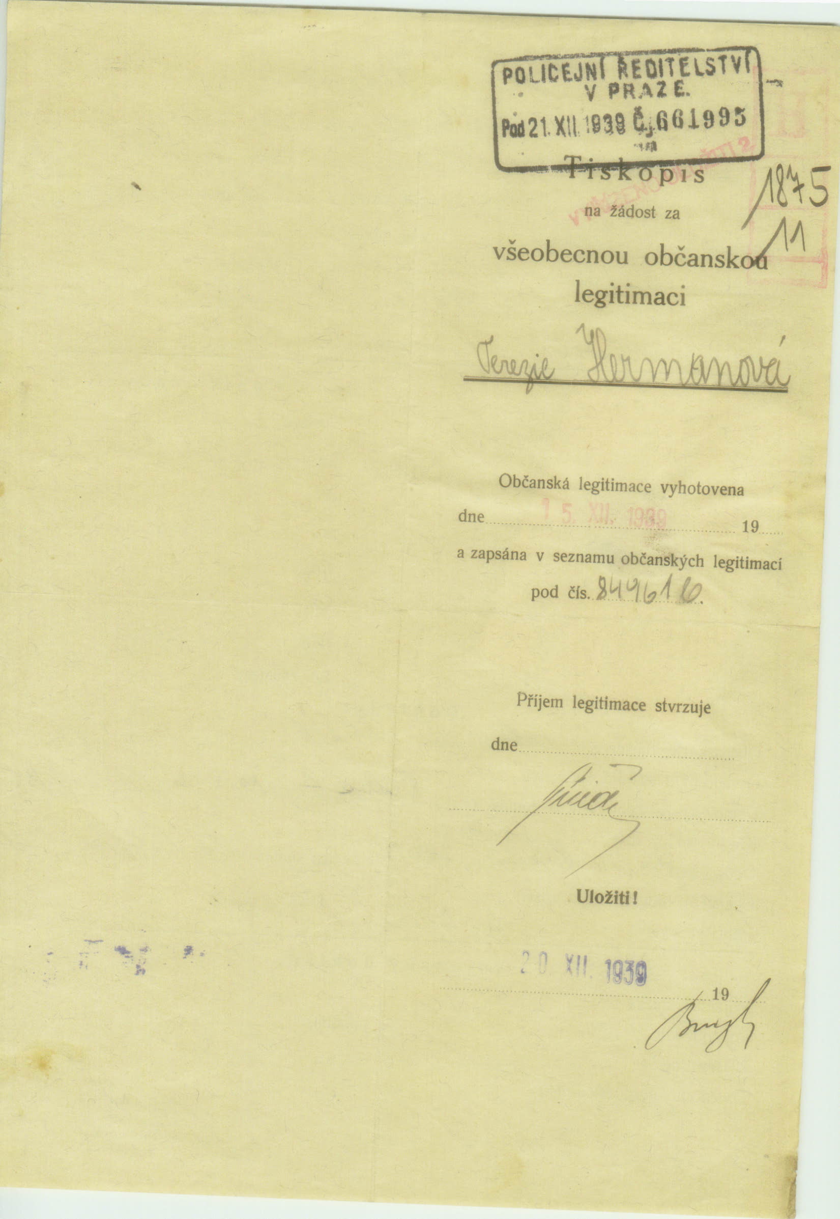 Hermanová Tereza: Žádost o vydání občanské legitimace