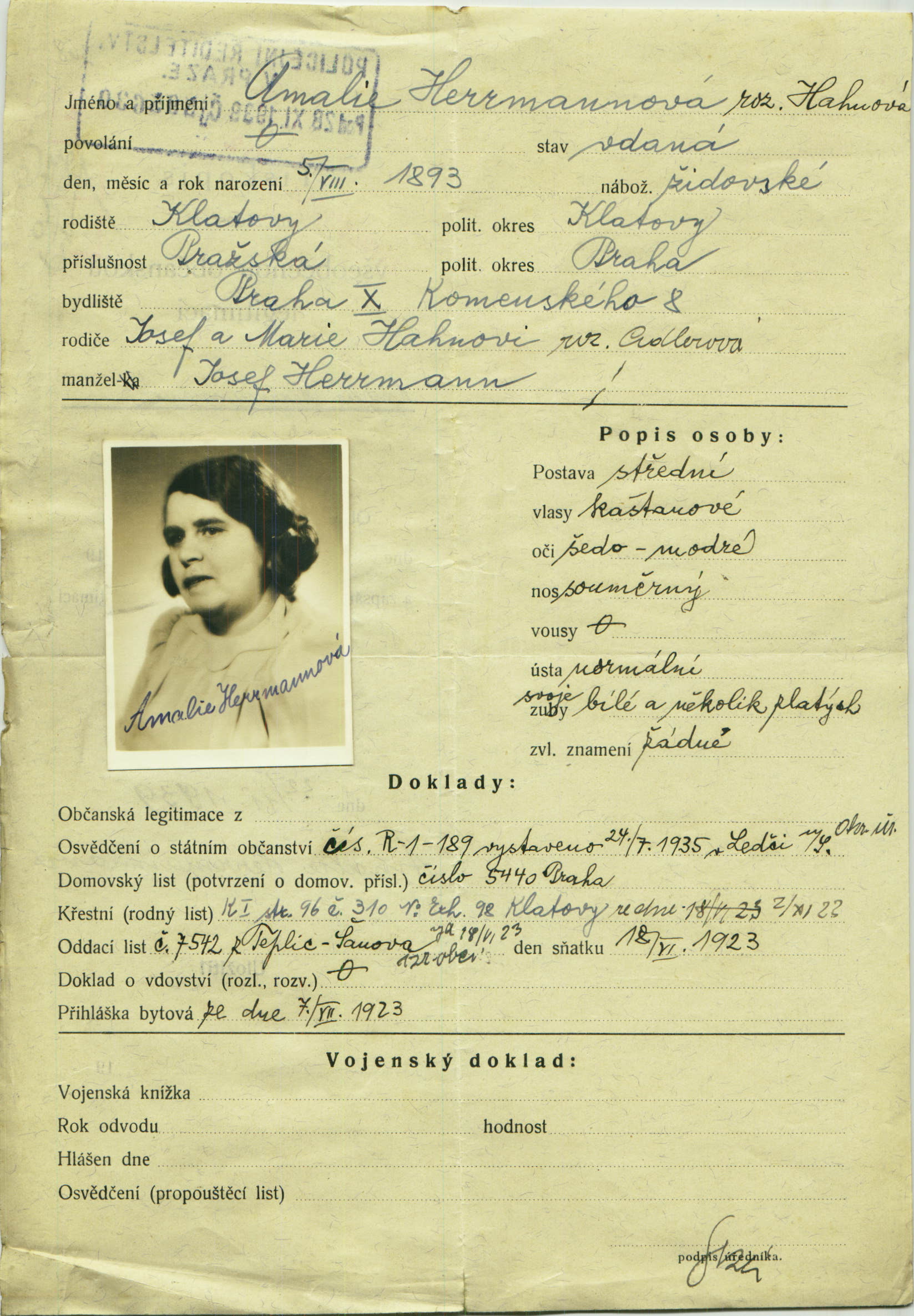 Herrmannová Amálie: Žádost o vydání občanské legitimace